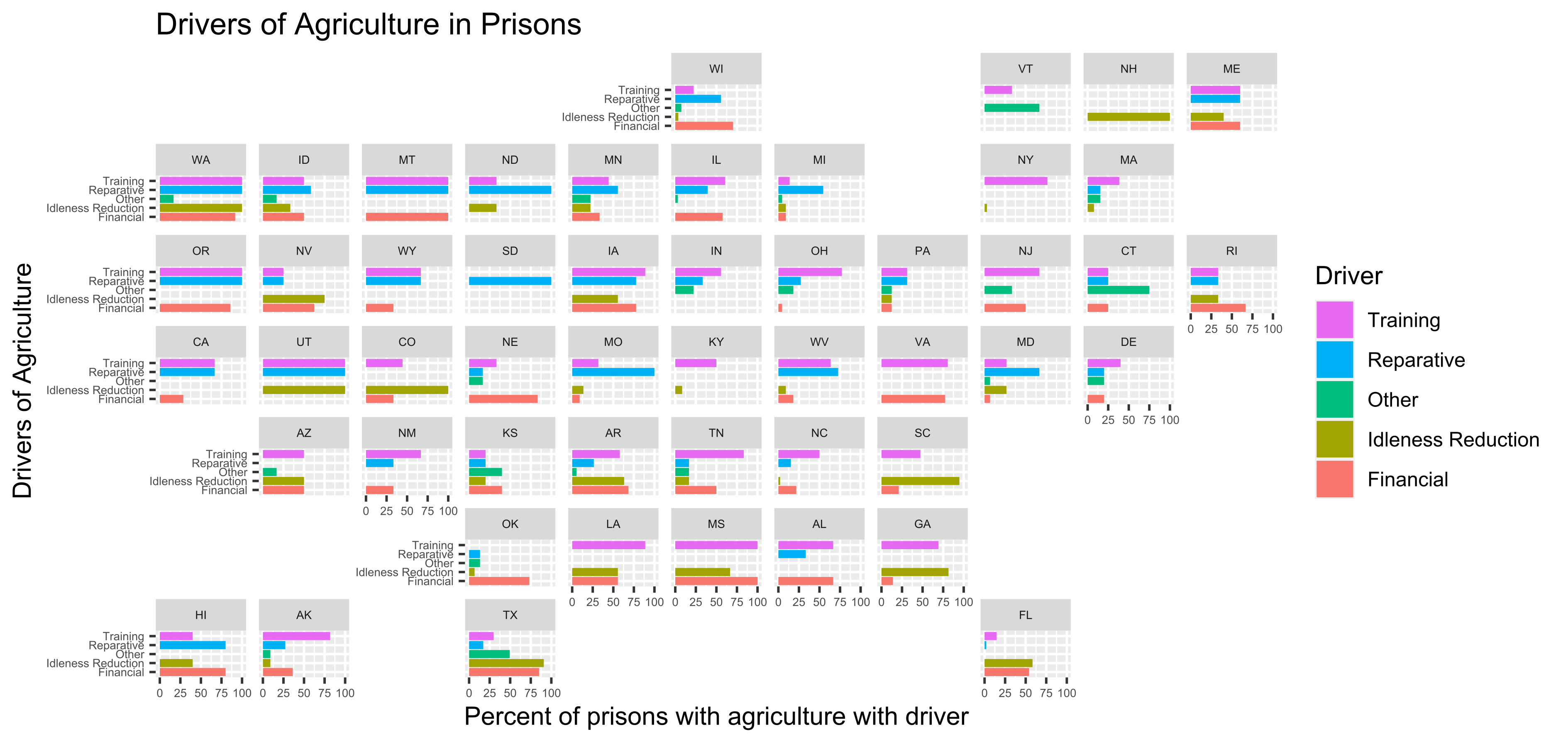 Use slider to compare drivers of agriculture in adult state-run prisons by count and proportion