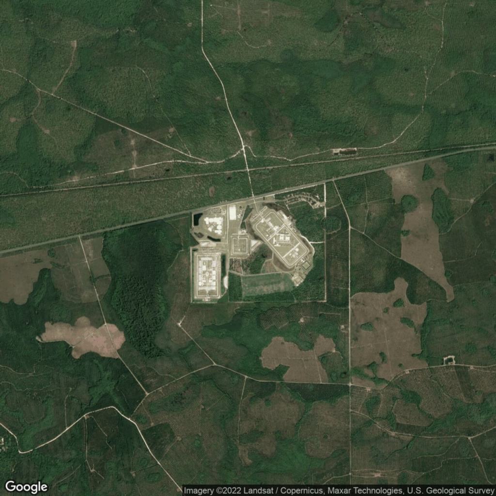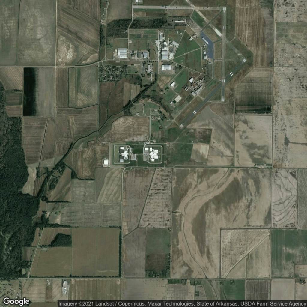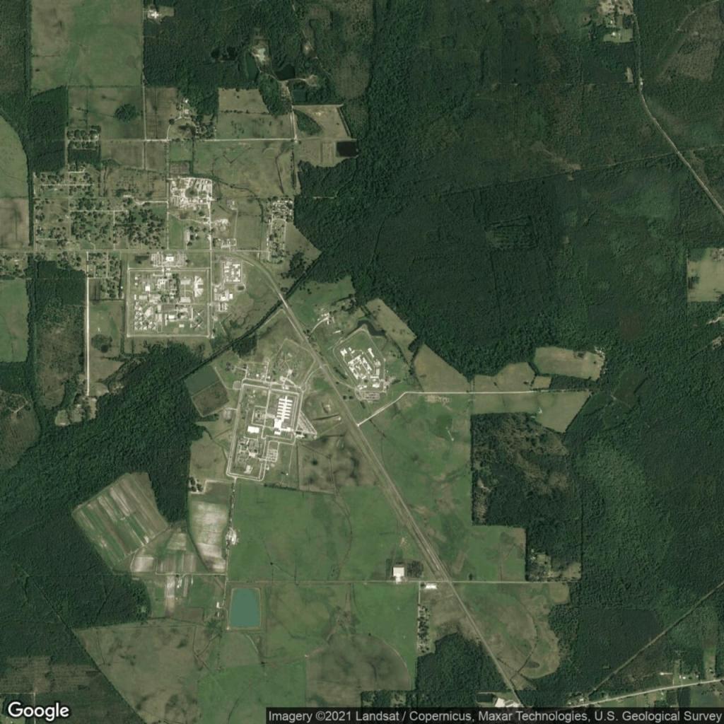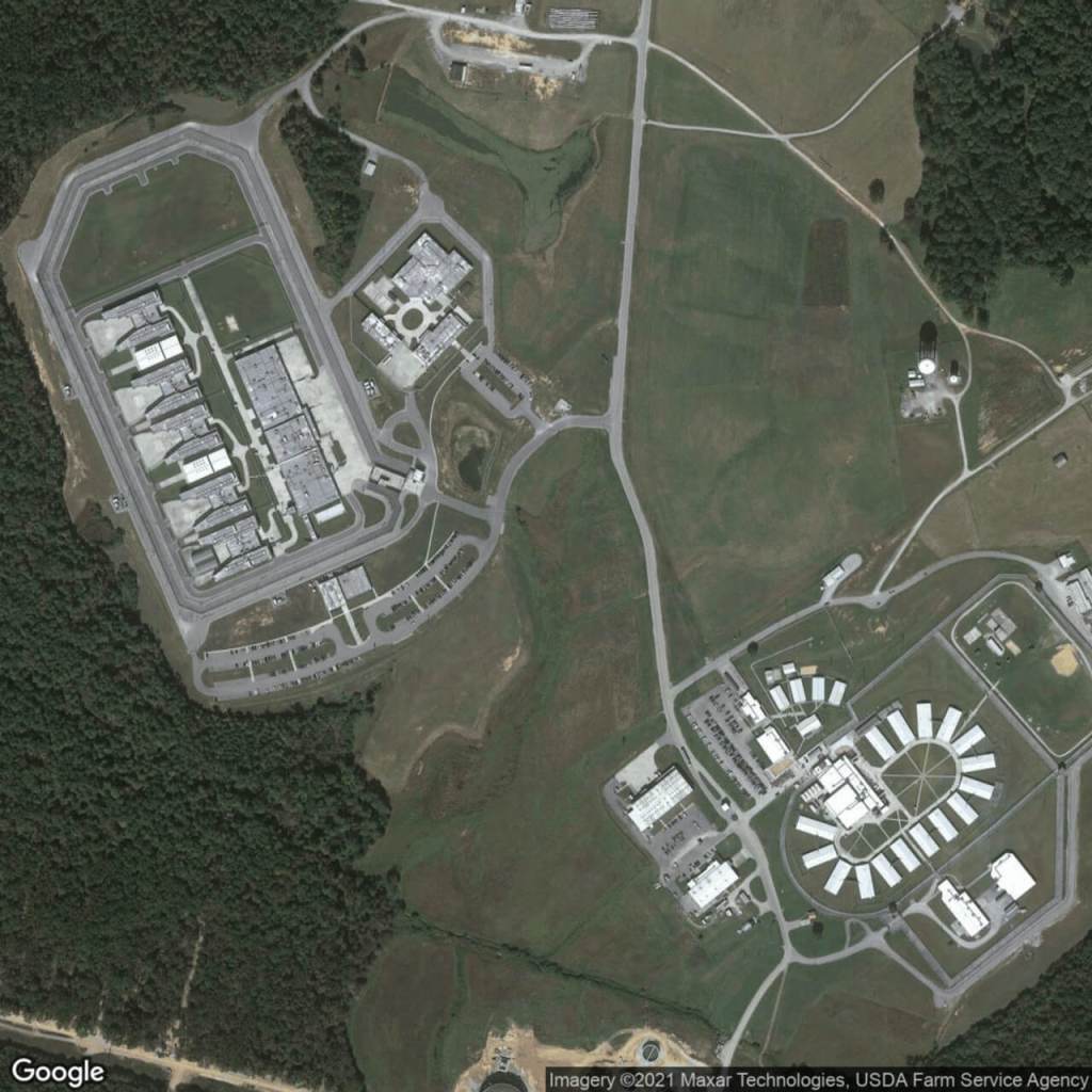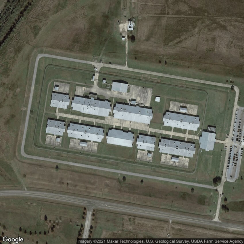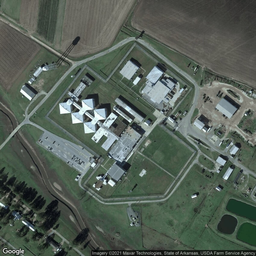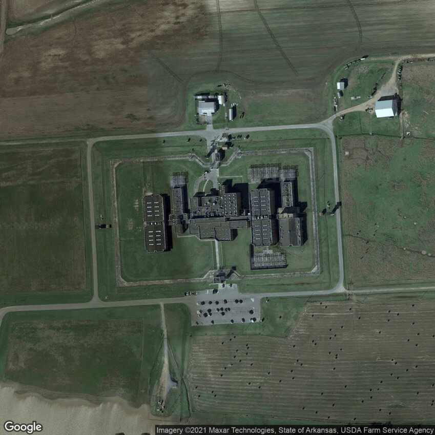 There are at least 662 prisons with prisoners who participate in some form of agriculture. This is sometimes visible from the air, revealing the carcerality of agricultural landscapes, while other times it is invisible, suggesting the carceral power to hide agricultural practices inside carceral architecture. While one could focus strictly on prisons, this would be to ignore the permeability of carceral space and the relationship of prisons to the broader social and ecological communities within which they reside. There are two images for each prison. The first is zoomed out to visually let the eyes stretch beyond prison walls, while the second is zoomed in to focus the viewer on the bricolage of agriculture and prison architecture.