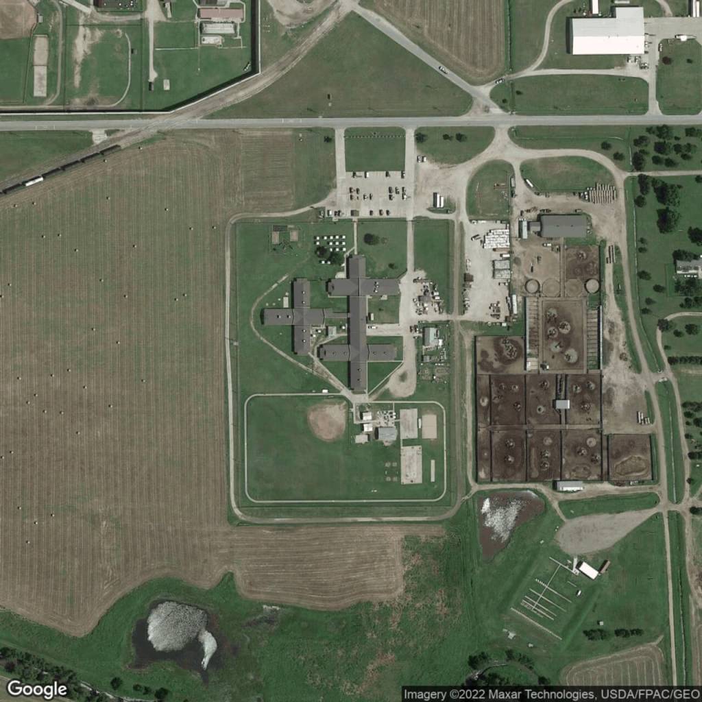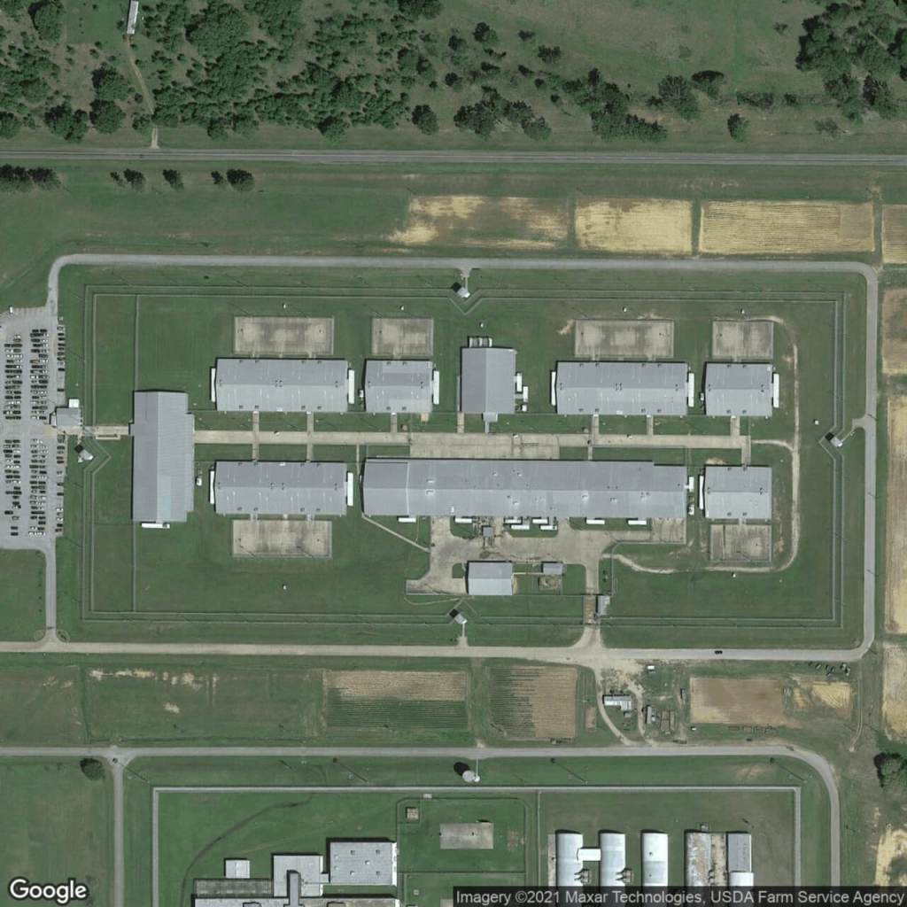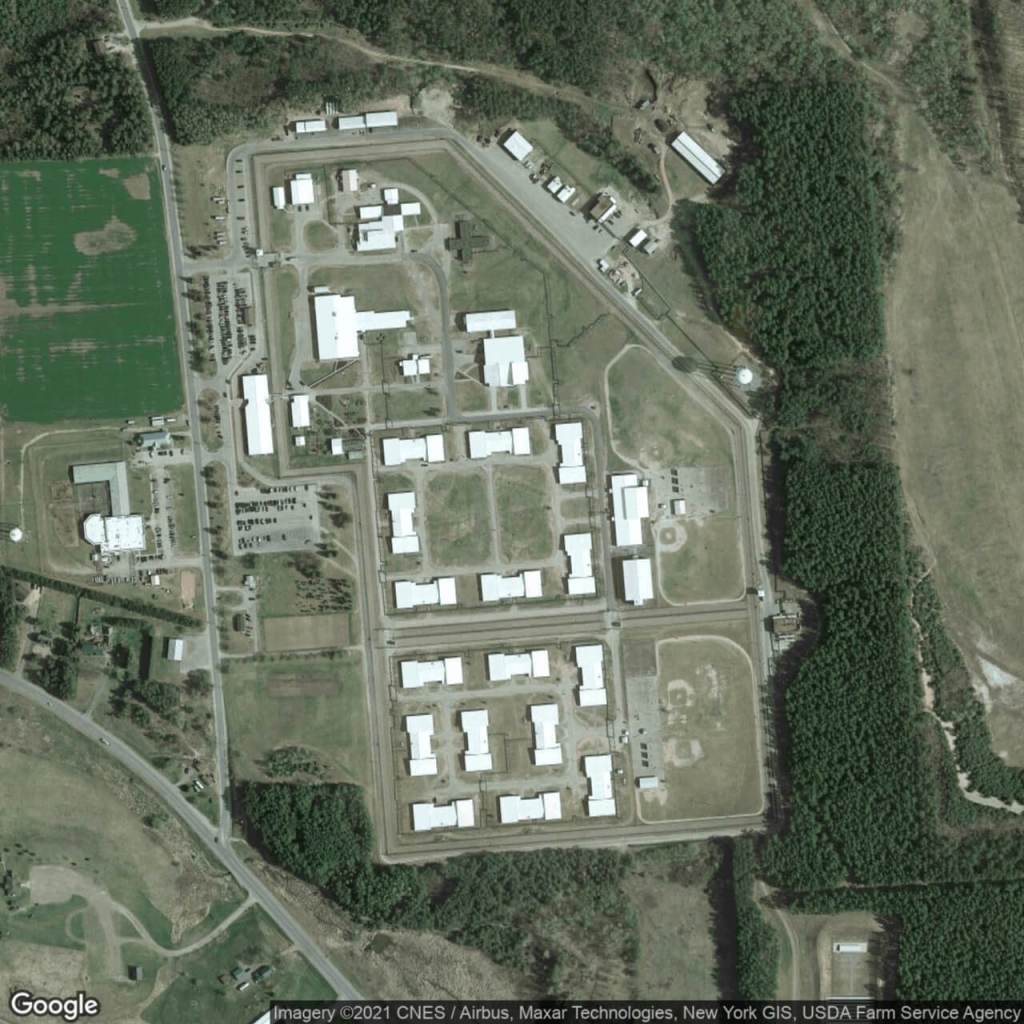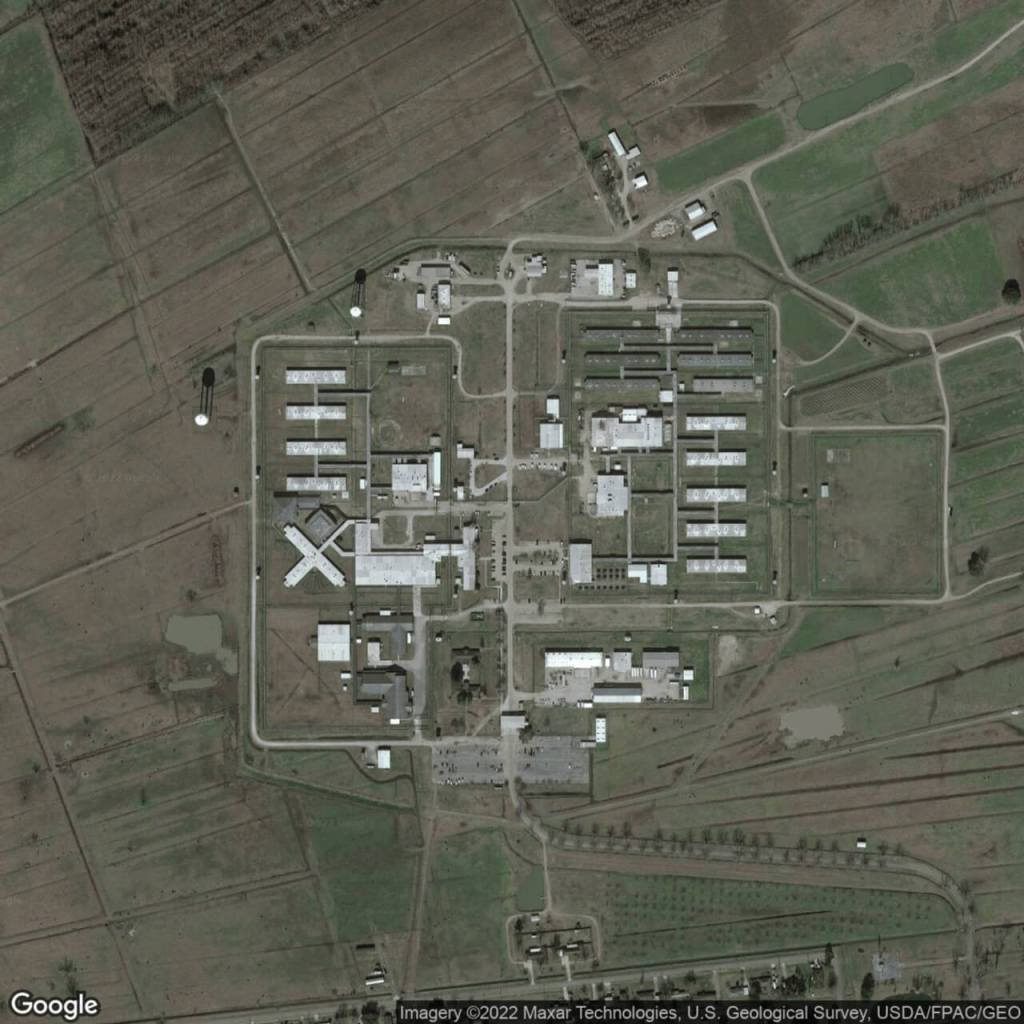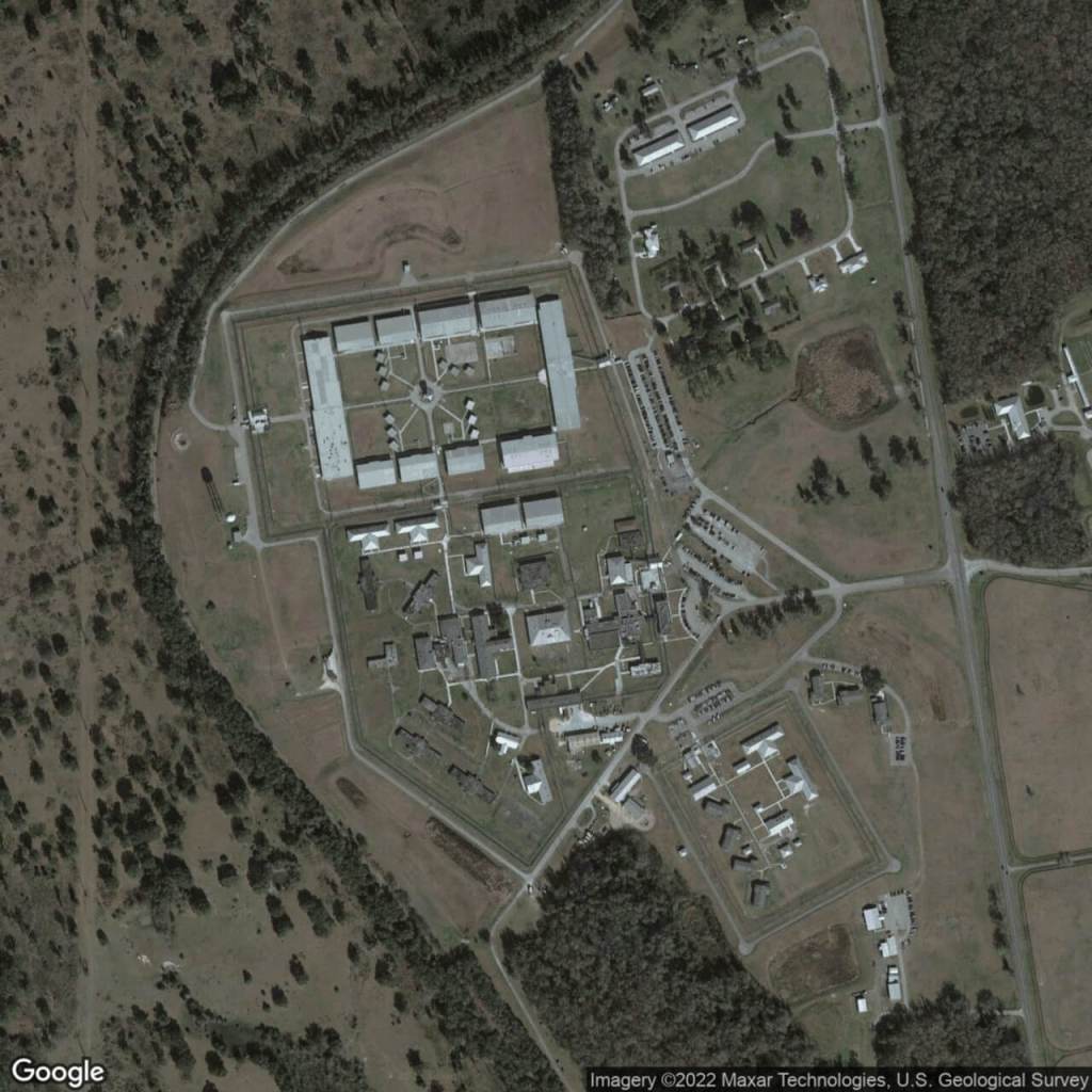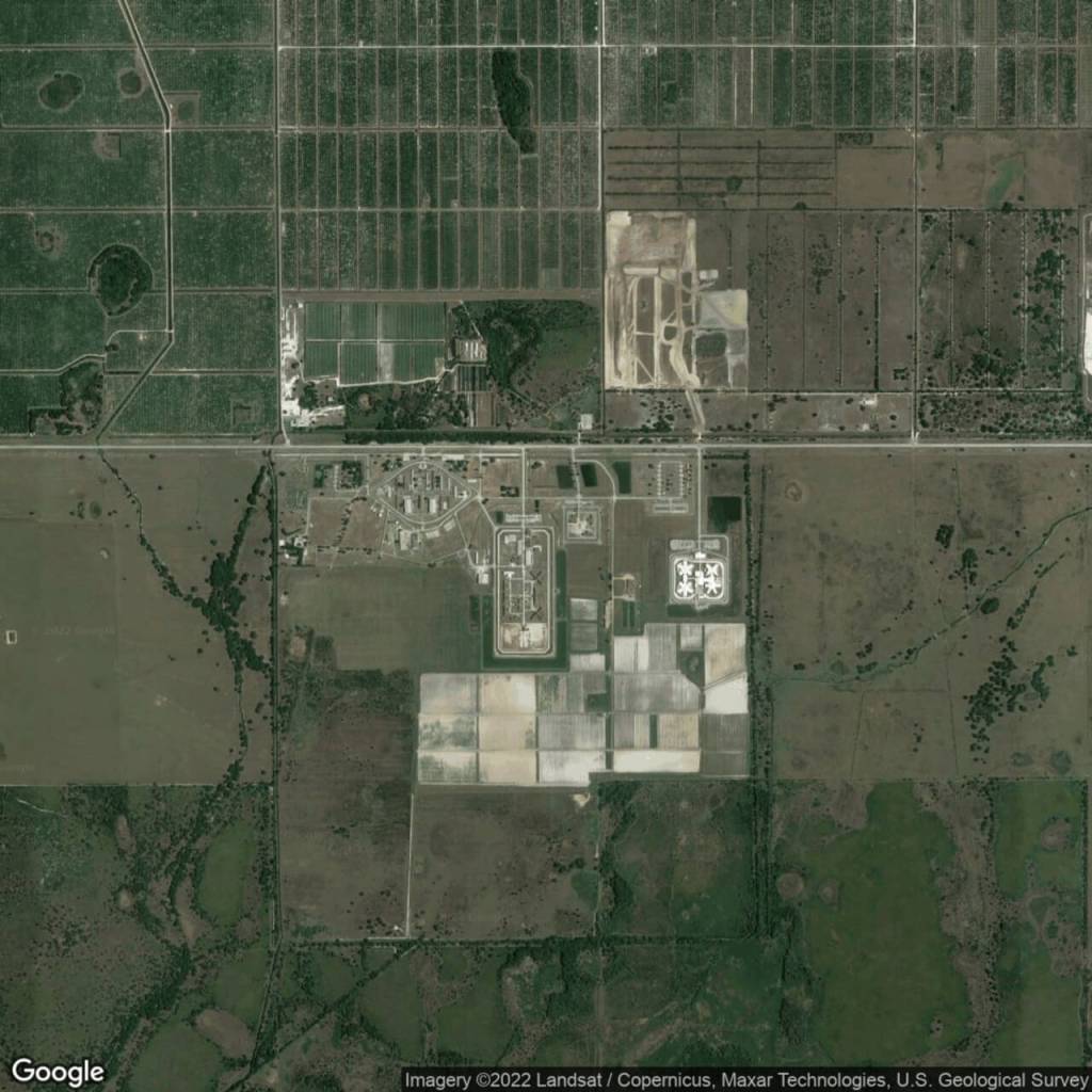 There are at least 662 prisons with prisoners who participate in some form of agriculture. This is sometimes visible from the air, revealing the carcerality of agricultural landscapes, while other times it is invisible, suggesting the carceral power to hide agricultural practices inside carceral architecture. While one could focus strictly on prisons, this would be to ignore the permeability of carceral space and the relationship of prisons to the broader social and ecological communities within which they reside. There are two images for each prison. The first is zoomed out to visually let the eyes stretch beyond prison walls, while the second is zoomed in to focus the viewer on the bricolage of agriculture and prison architecture.