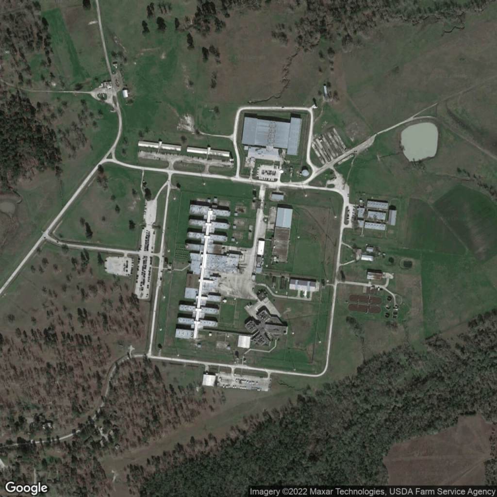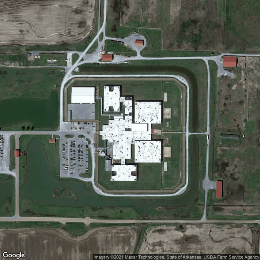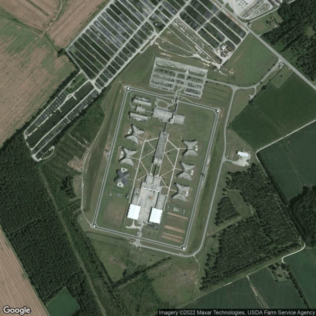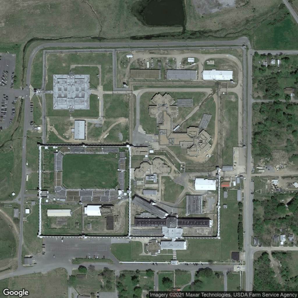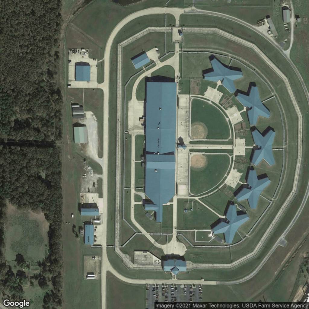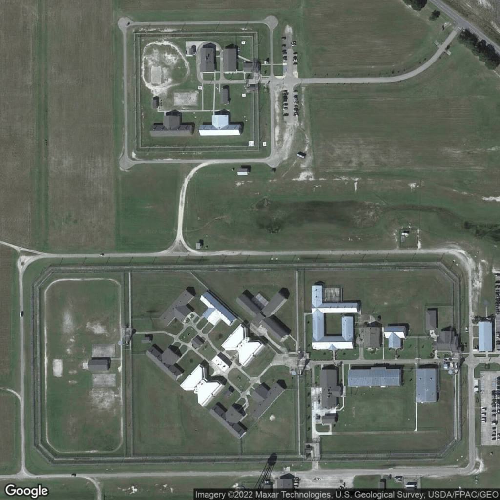 There are at least 662 prisons with prisoners who participate in some form of agriculture. This is sometimes visible from the air, revealing the carcerality of agricultural landscapes, while other times it is invisible, suggesting the carceral power to hide agricultural practices inside carceral architecture. While one could focus strictly on prisons, this would be to ignore the permeability of carceral space and the relationship of prisons to the broader social and ecological communities within which they reside. There are two images for each prison. The first is zoomed out to visually let the eyes stretch beyond prison walls, while the second is zoomed in to focus the viewer on the bricolage of agriculture and prison architecture.