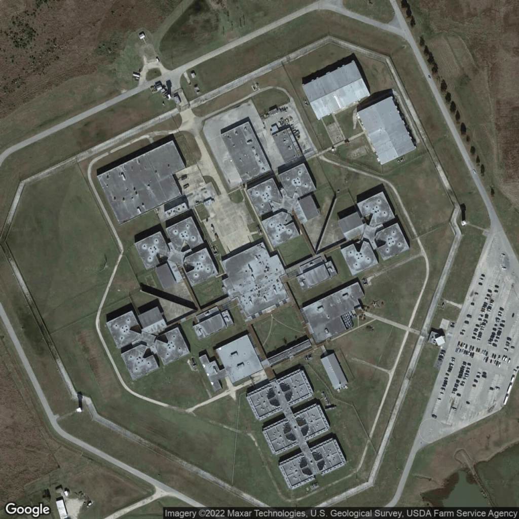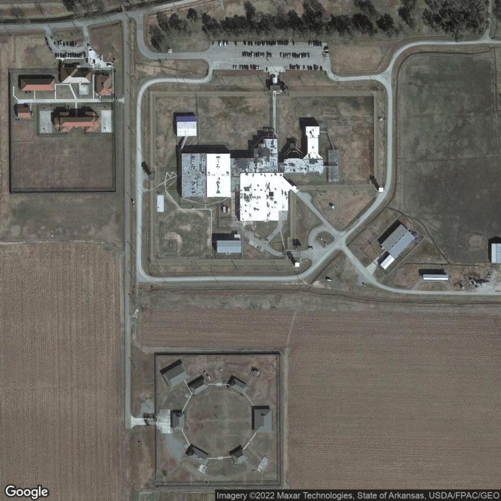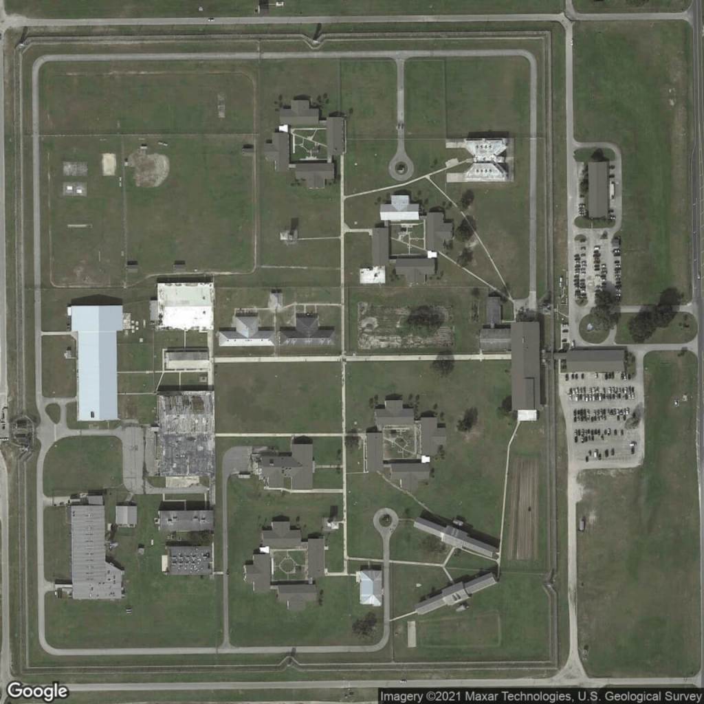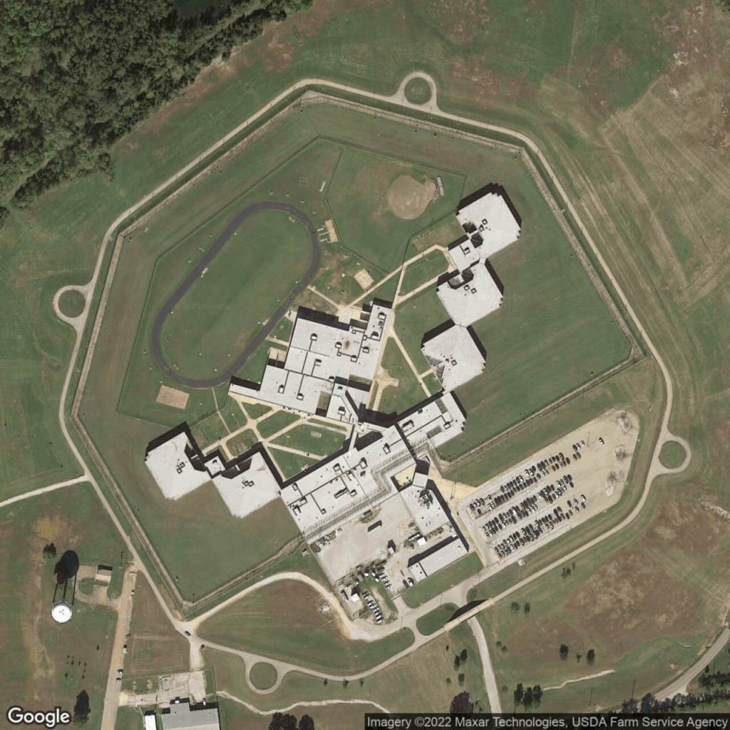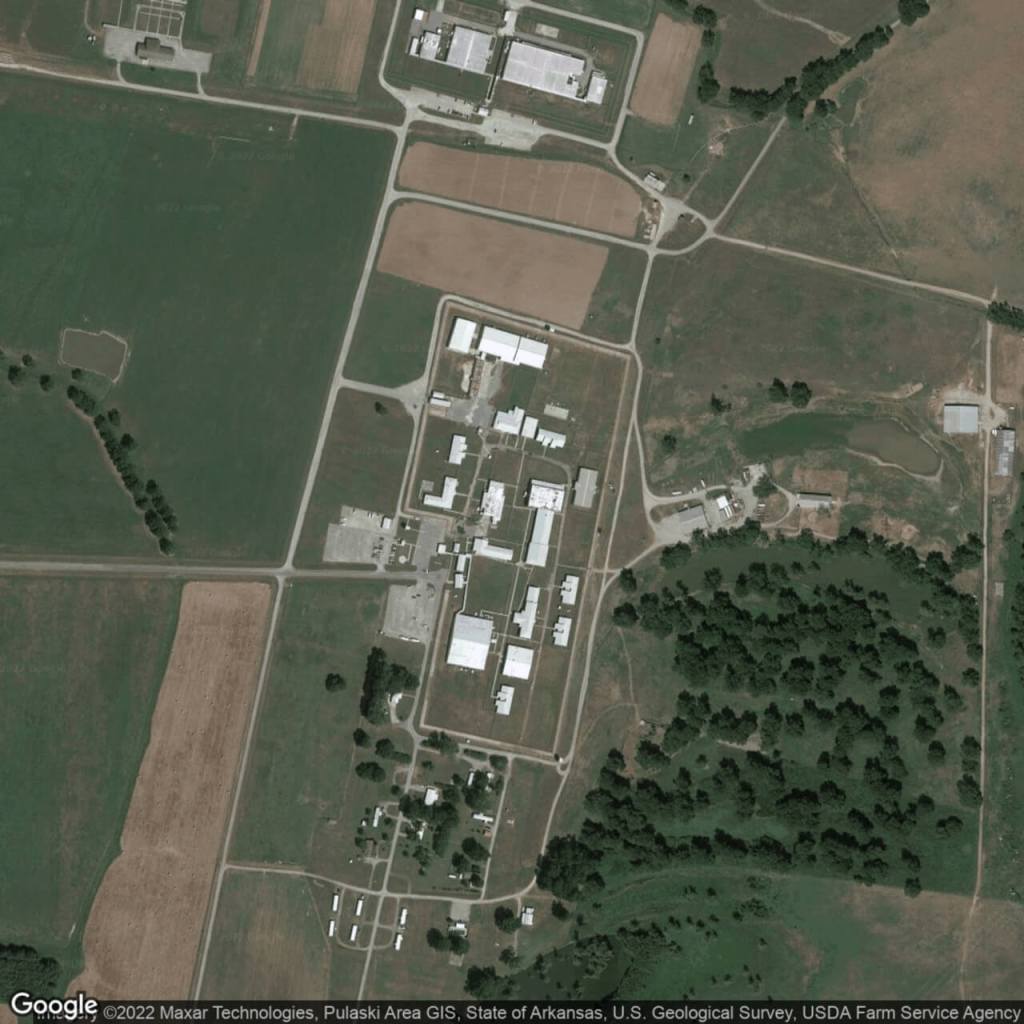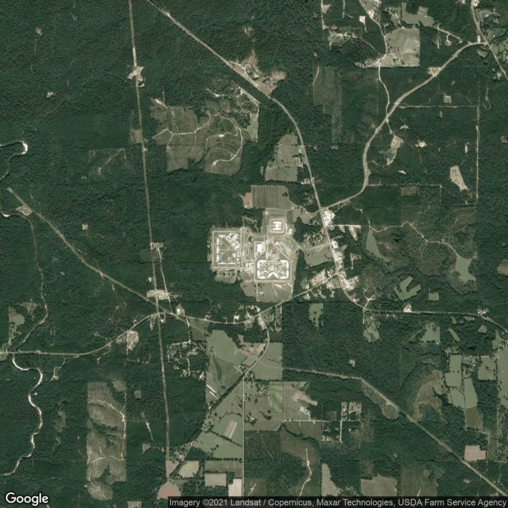 There are at least 662 prisons with prisoners who participate in some form of agriculture. This is sometimes visible from the air, revealing the carcerality of agricultural landscapes, while other times it is invisible, suggesting the carceral power to hide agricultural practices inside carceral architecture. While one could focus strictly on prisons, this would be to ignore the permeability of carceral space and the relationship of prisons to the broader social and ecological communities within which they reside. There are two images for each prison. The first is zoomed out to visually let the eyes stretch beyond prison walls, while the second is zoomed in to focus the viewer on the bricolage of agriculture and prison architecture.