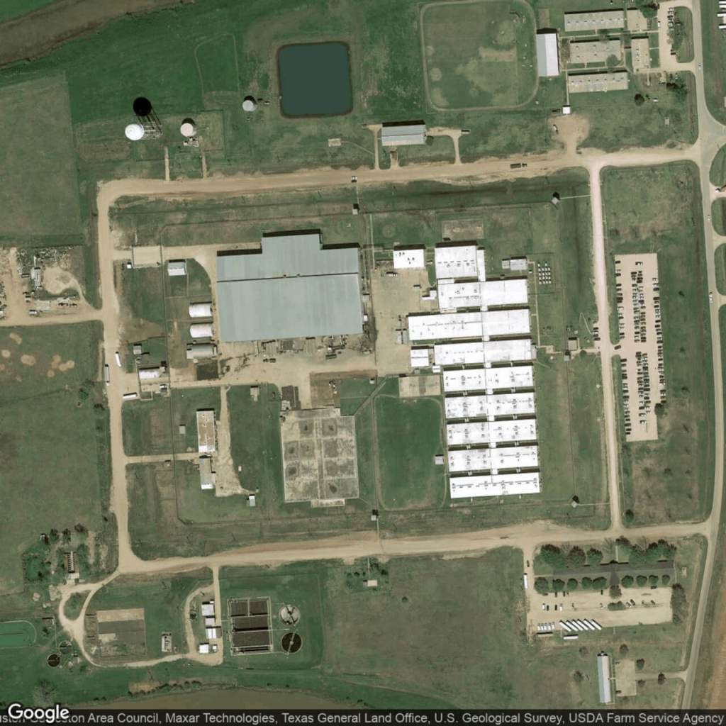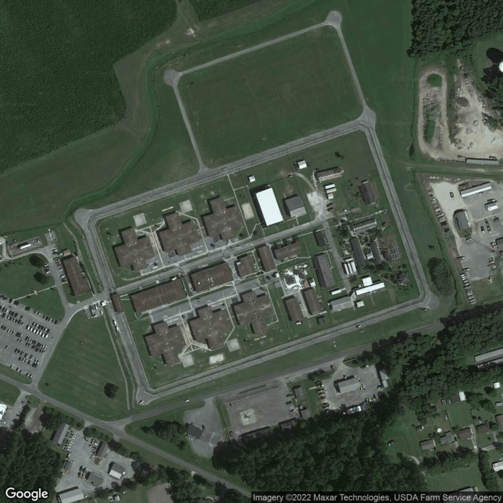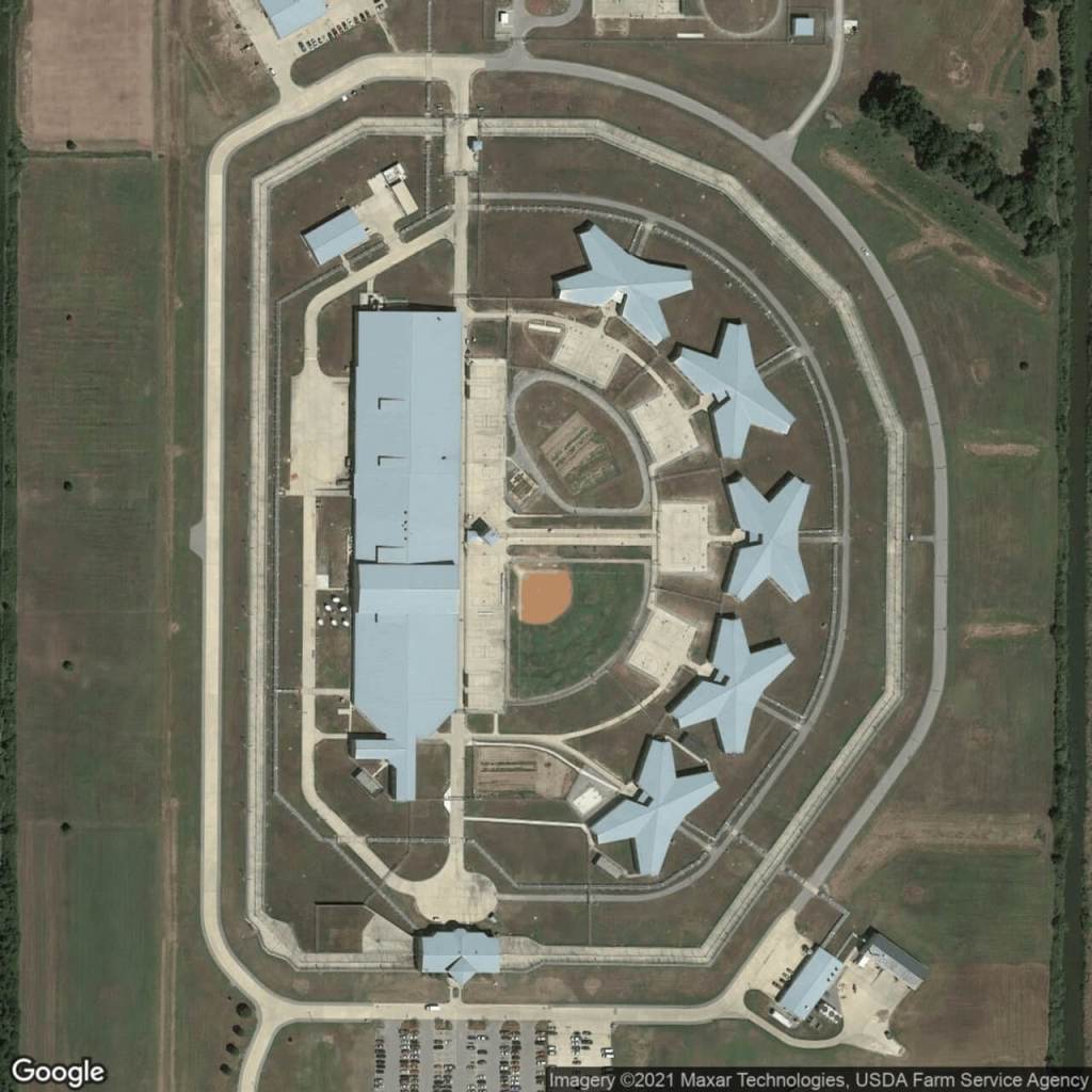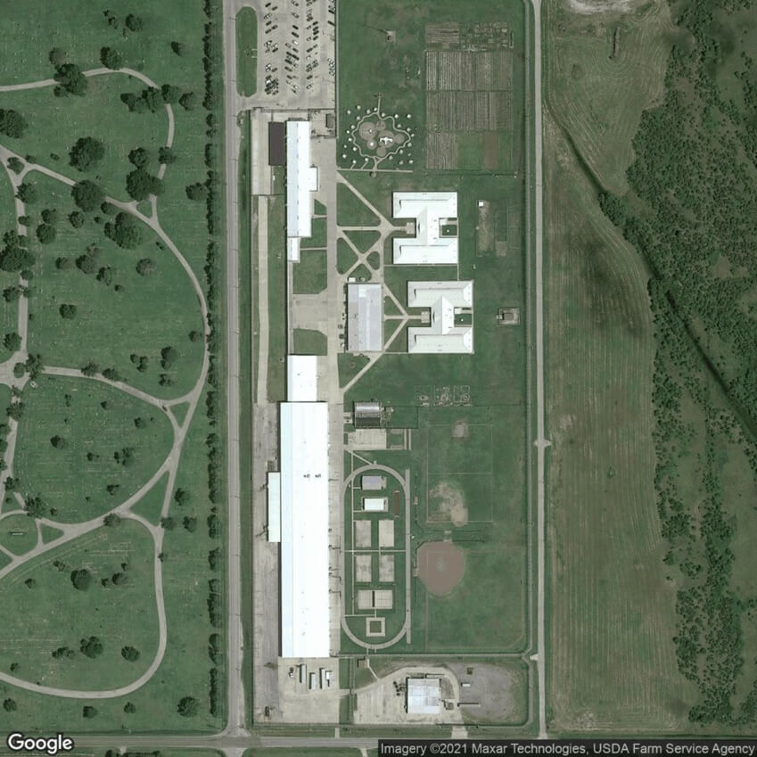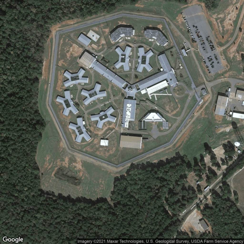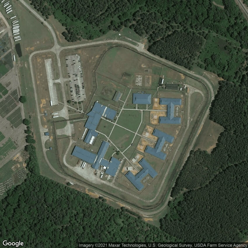 There are at least 662 prisons with prisoners who participate in some form of agriculture. This is sometimes visible from the air, revealing the carcerality of agricultural landscapes, while other times it is invisible, suggesting the carceral power to hide agricultural practices inside carceral architecture. While one could focus strictly on prisons, this would be to ignore the permeability of carceral space and the relationship of prisons to the broader social and ecological communities within which they reside. There are two images for each prison. The first is zoomed out to visually let the eyes stretch beyond prison walls, while the second is zoomed in to focus the viewer on the bricolage of agriculture and prison architecture.