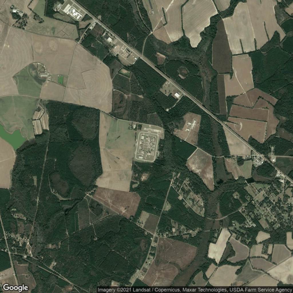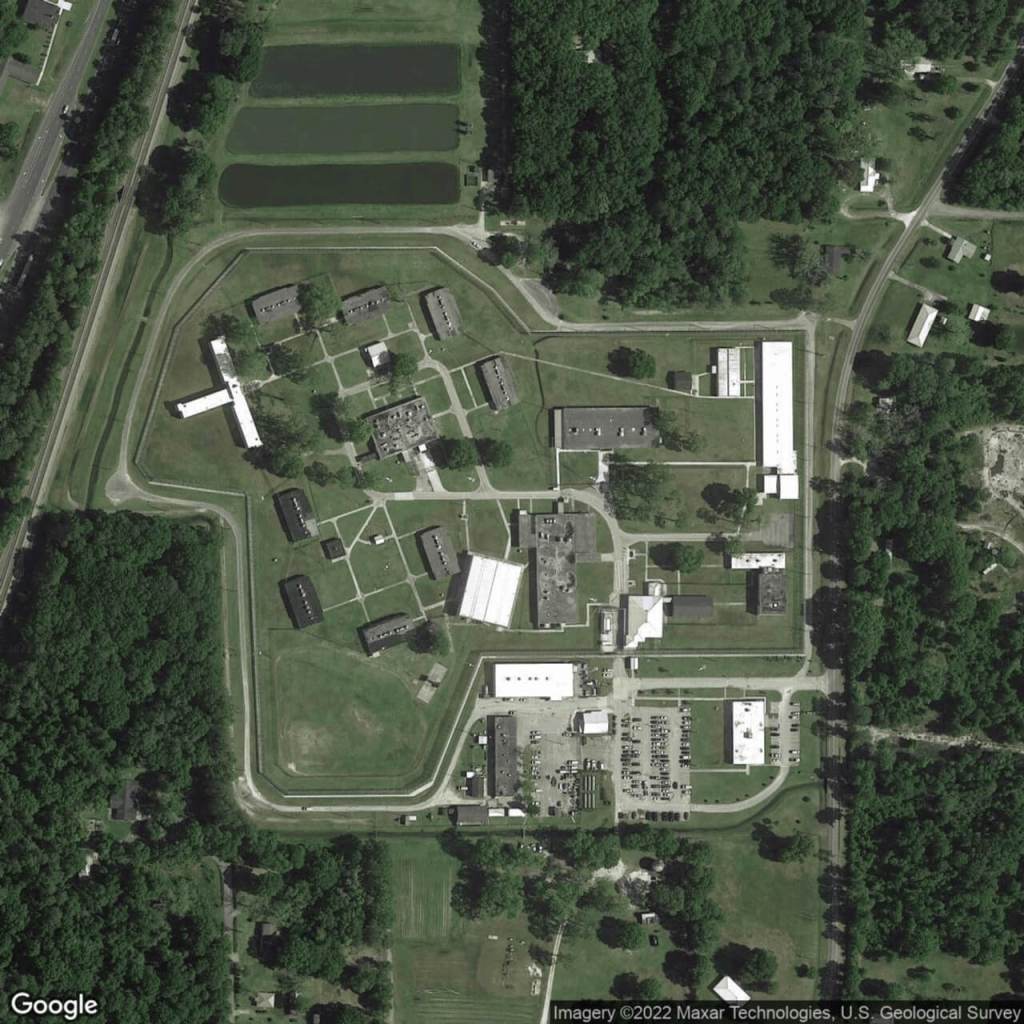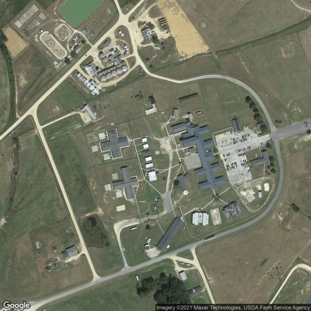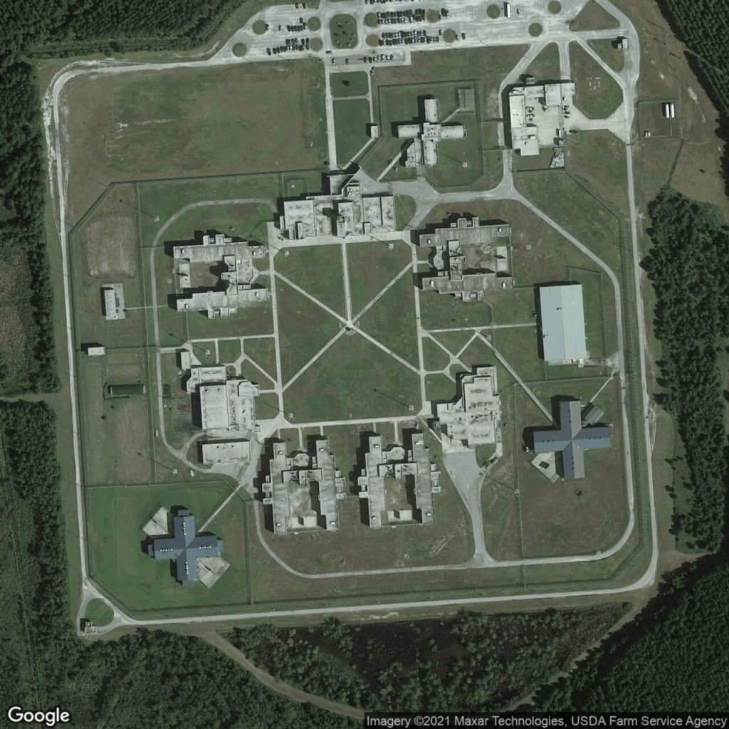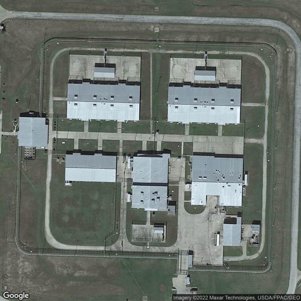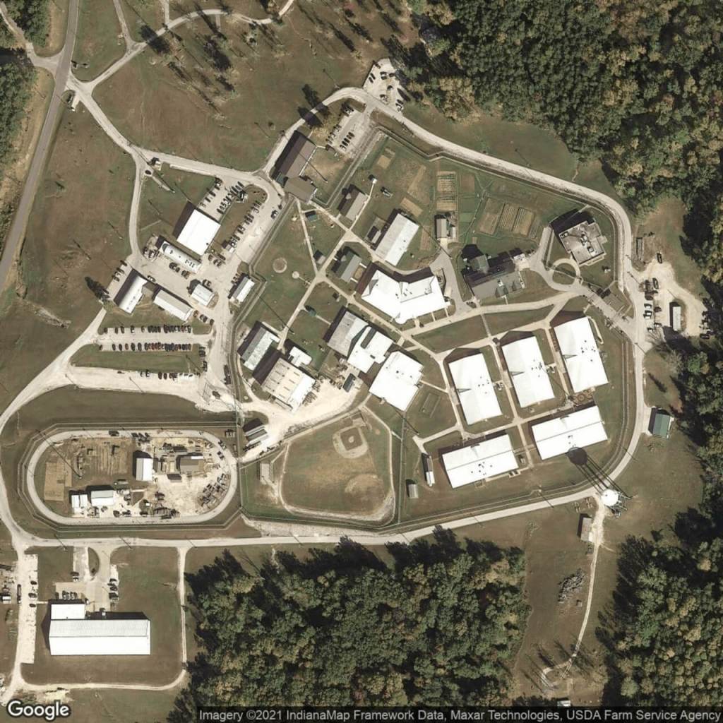 There are at least 662 prisons with prisoners who participate in some form of agriculture. This is sometimes visible from the air, revealing the carcerality of agricultural landscapes, while other times it is invisible, suggesting the carceral power to hide agricultural practices inside carceral architecture. While one could focus strictly on prisons, this would be to ignore the permeability of carceral space and the relationship of prisons to the broader social and ecological communities within which they reside. There are two images for each prison. The first is zoomed out to visually let the eyes stretch beyond prison walls, while the second is zoomed in to focus the viewer on the bricolage of agriculture and prison architecture.