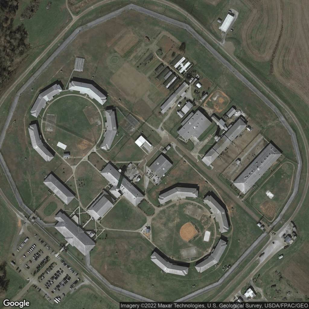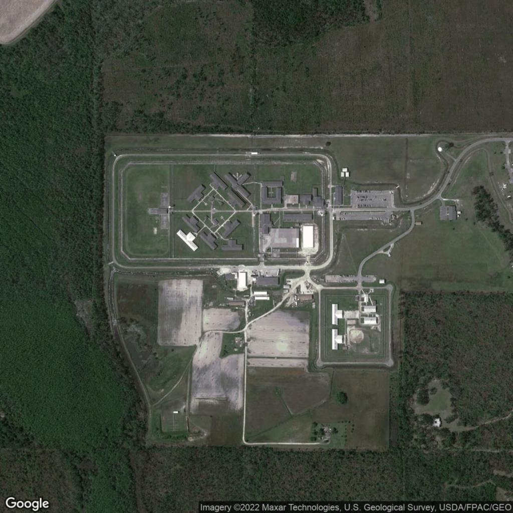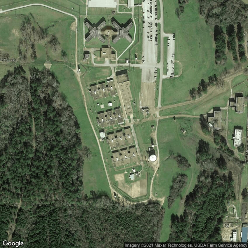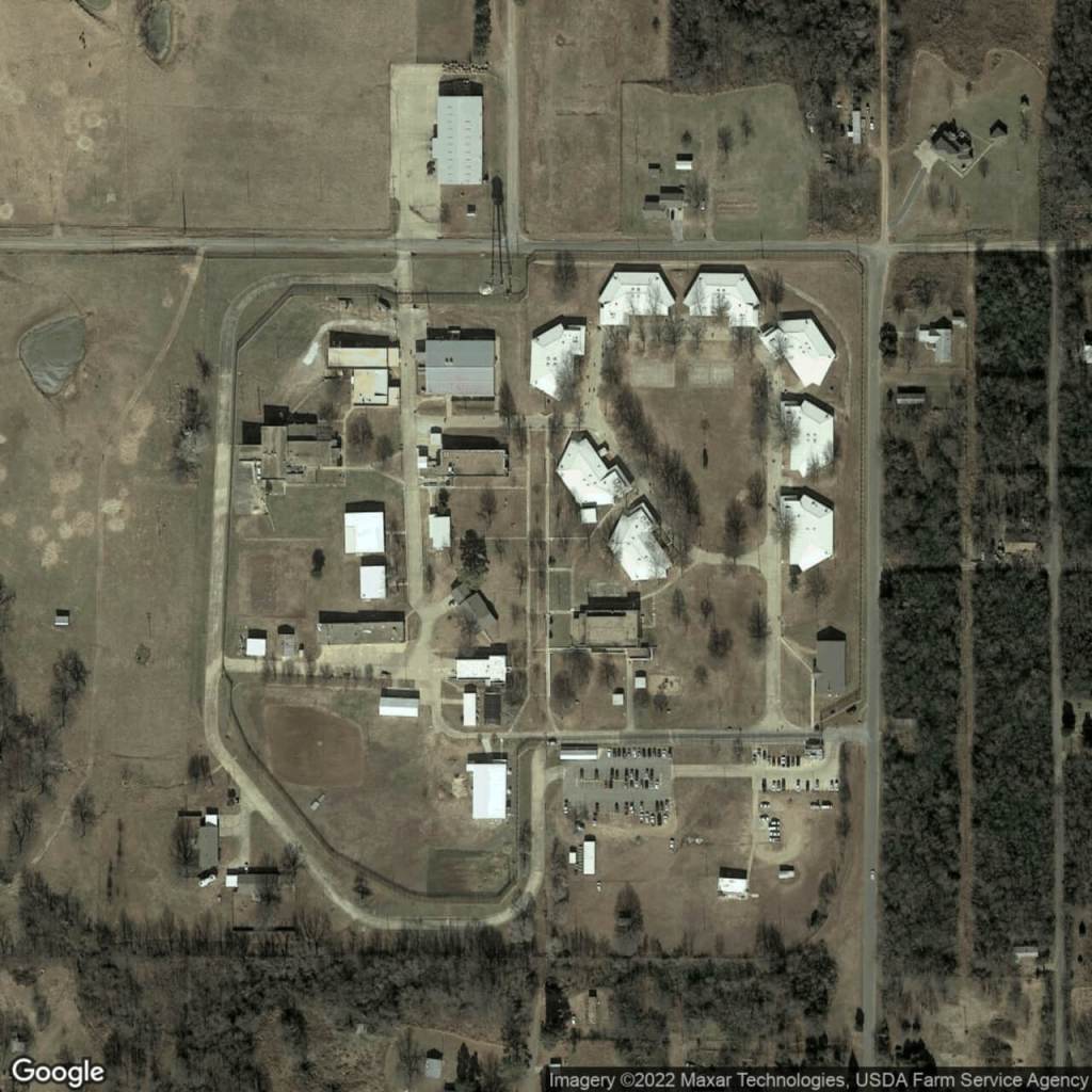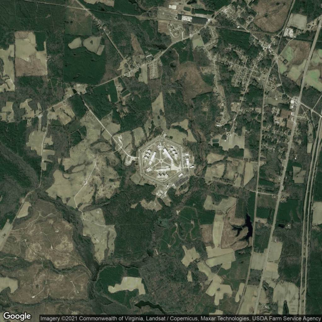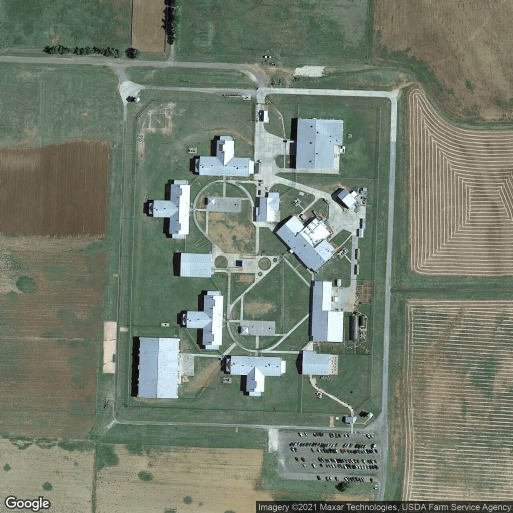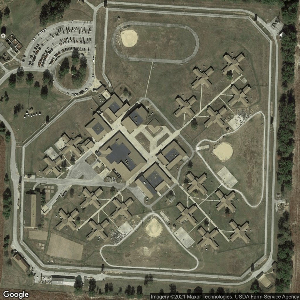 There are at least 662 prisons with prisoners who participate in some form of agriculture. This is sometimes visible from the air, revealing the carcerality of agricultural landscapes, while other times it is invisible, suggesting the carceral power to hide agricultural practices inside carceral architecture. While one could focus strictly on prisons, this would be to ignore the permeability of carceral space and the relationship of prisons to the broader social and ecological communities within which they reside. There are two images for each prison. The first is zoomed out to visually let the eyes stretch beyond prison walls, while the second is zoomed in to focus the viewer on the bricolage of agriculture and prison architecture.