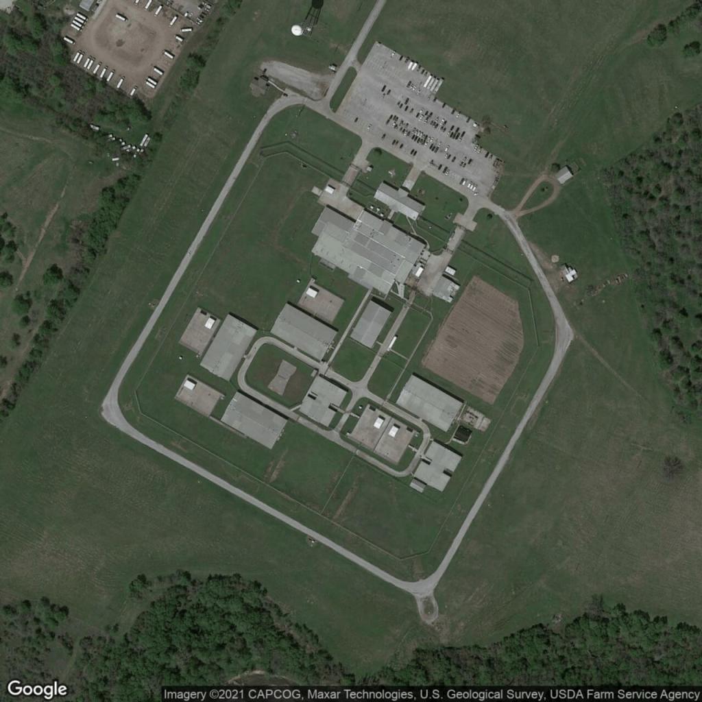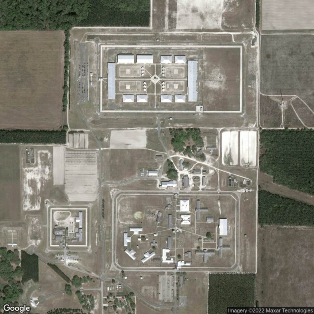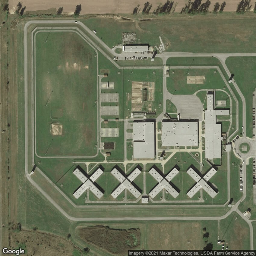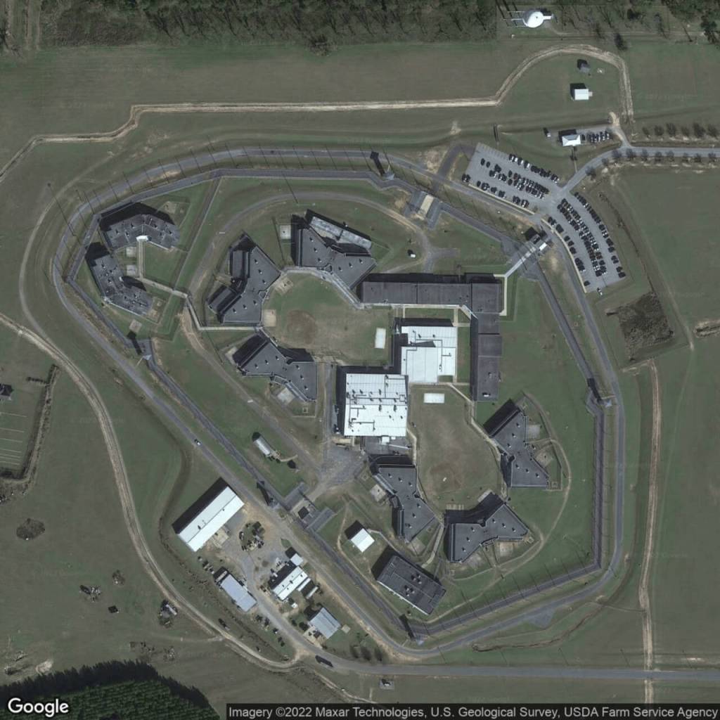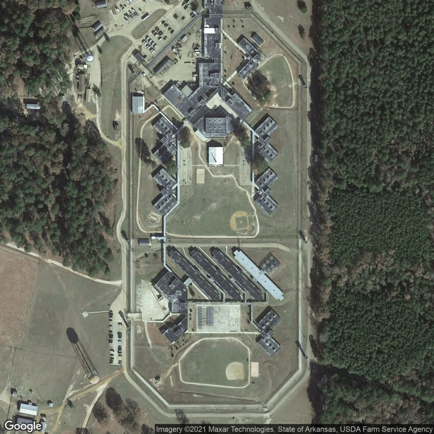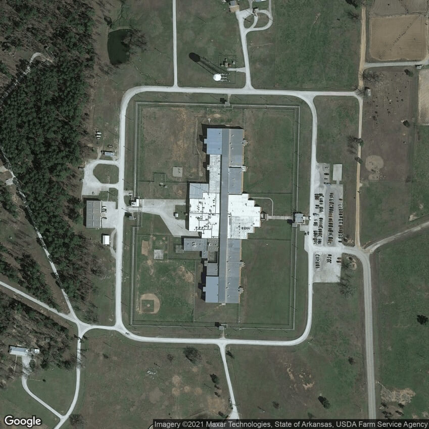 There are at least 662 prisons with prisoners who participate in some form of agriculture. This is sometimes visible from the air, revealing the carcerality of agricultural landscapes, while other times it is invisible, suggesting the carceral power to hide agricultural practices inside carceral architecture. While one could focus strictly on prisons, this would be to ignore the permeability of carceral space and the relationship of prisons to the broader social and ecological communities within which they reside. There are two images for each prison. The first is zoomed out to visually let the eyes stretch beyond prison walls, while the second is zoomed in to focus the viewer on the bricolage of agriculture and prison architecture.
