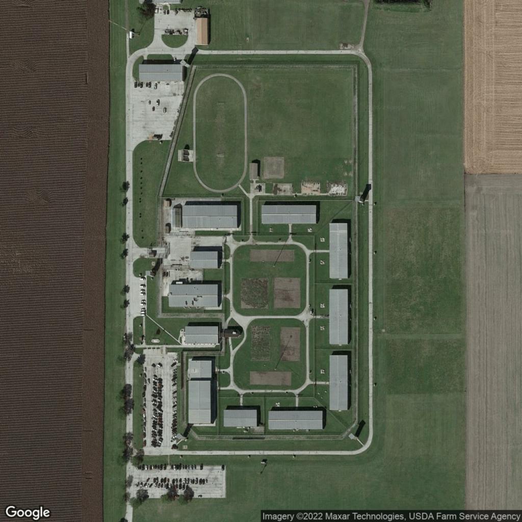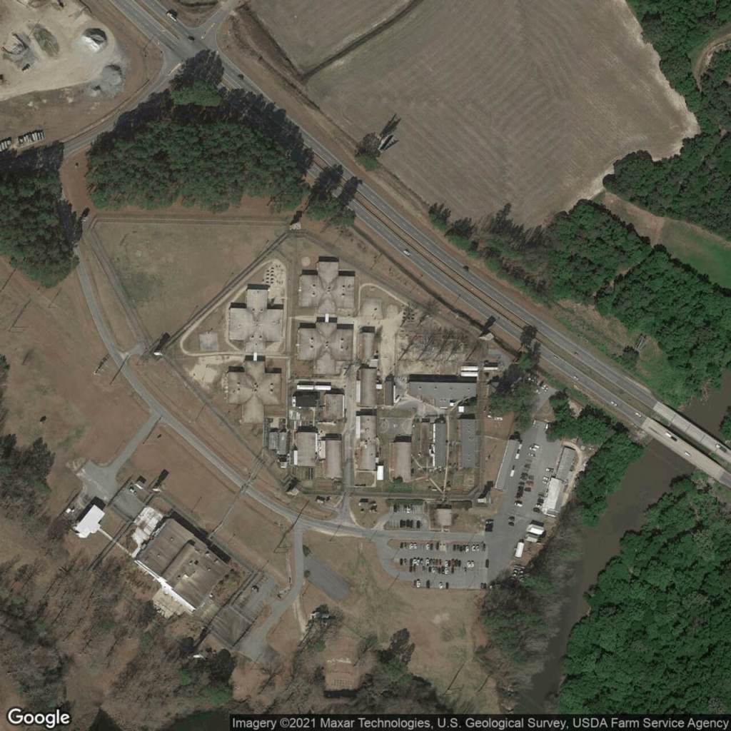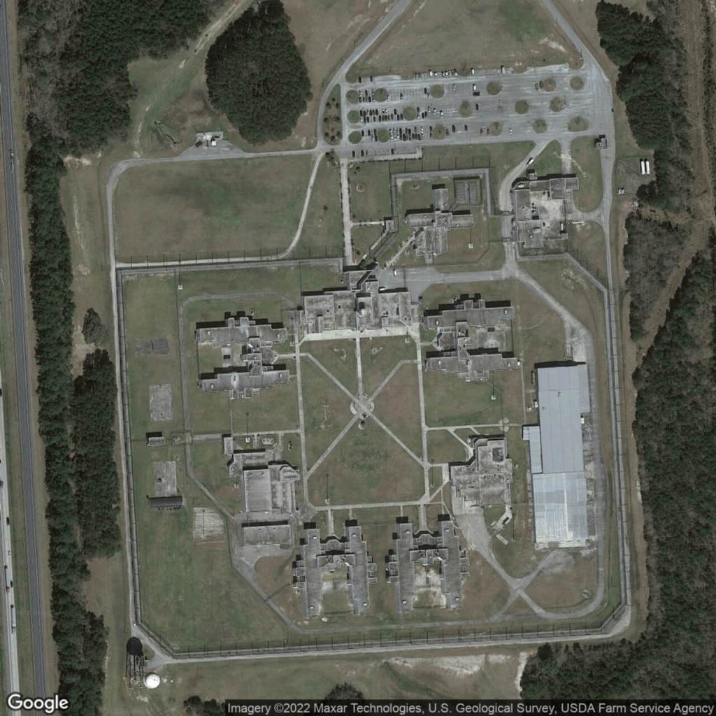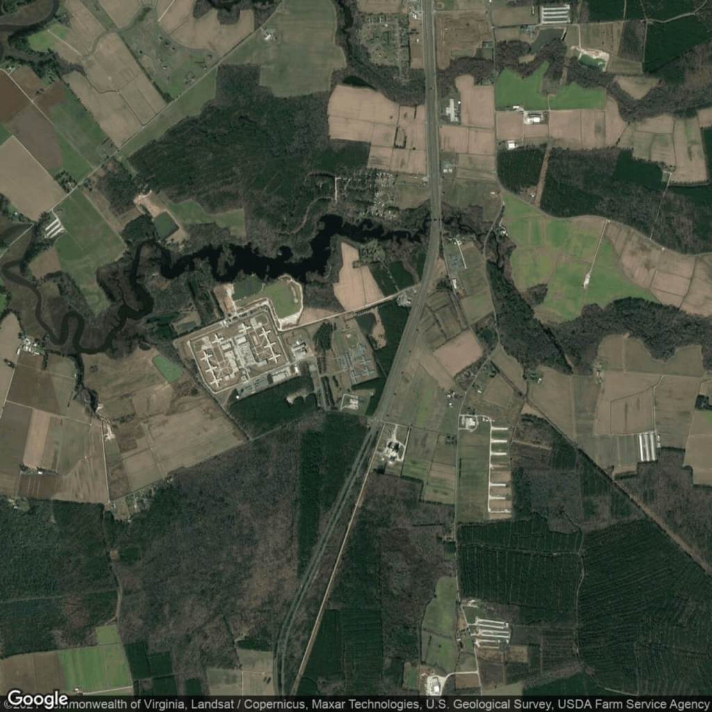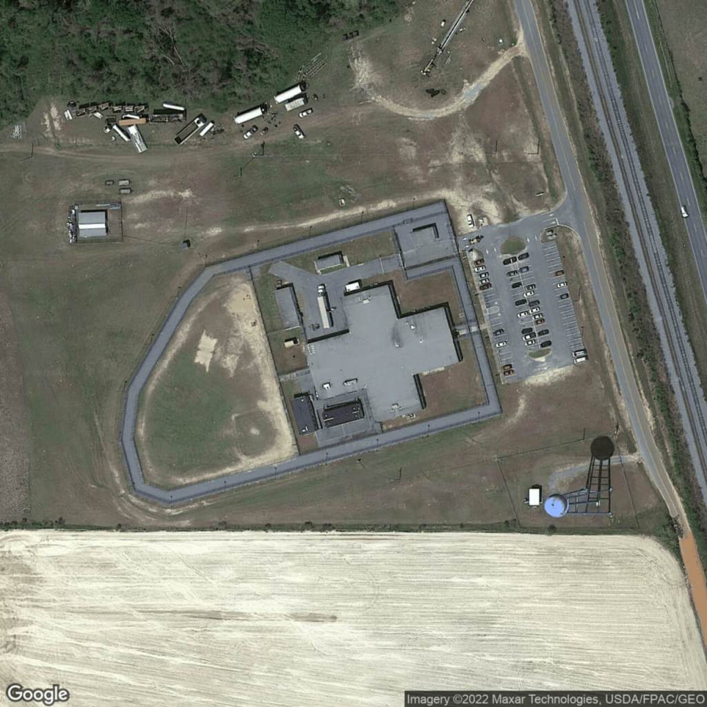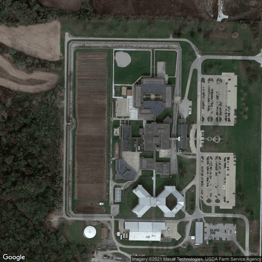 There are at least 662 prisons with prisoners who participate in some form of agriculture. This is sometimes visible from the air, revealing the carcerality of agricultural landscapes, while other times it is invisible, suggesting the carceral power to hide agricultural practices inside carceral architecture. While one could focus strictly on prisons, this would be to ignore the permeability of carceral space and the relationship of prisons to the broader social and ecological communities within which they reside. There are two images for each prison. The first is zoomed out to visually let the eyes stretch beyond prison walls, while the second is zoomed in to focus the viewer on the bricolage of agriculture and prison architecture.