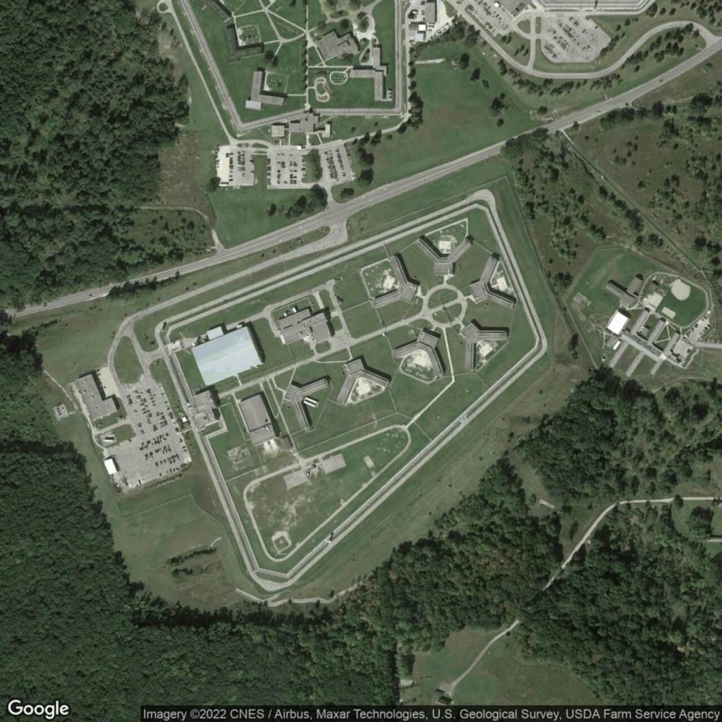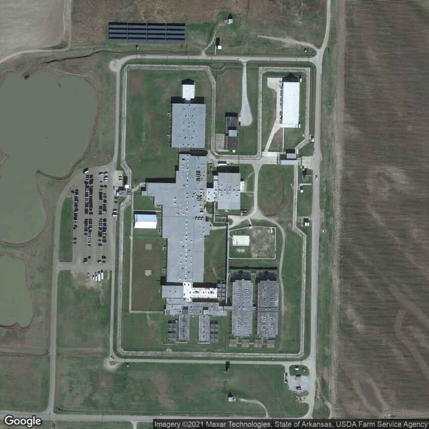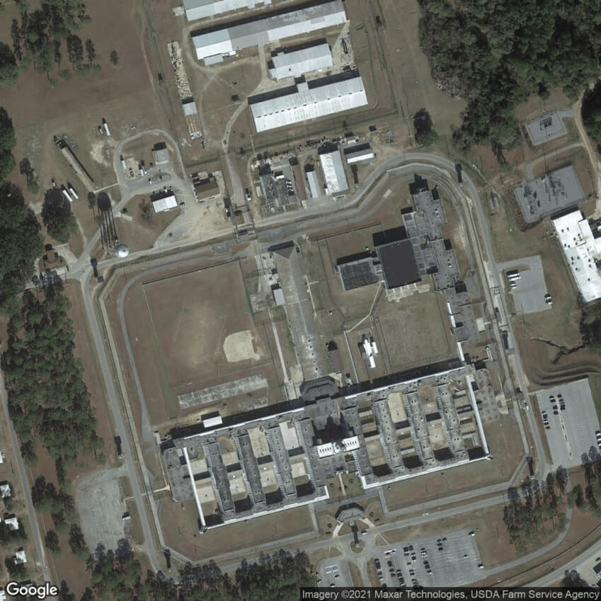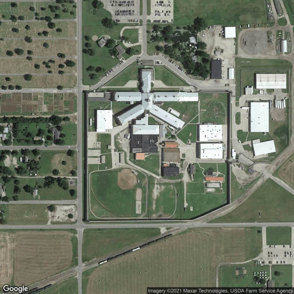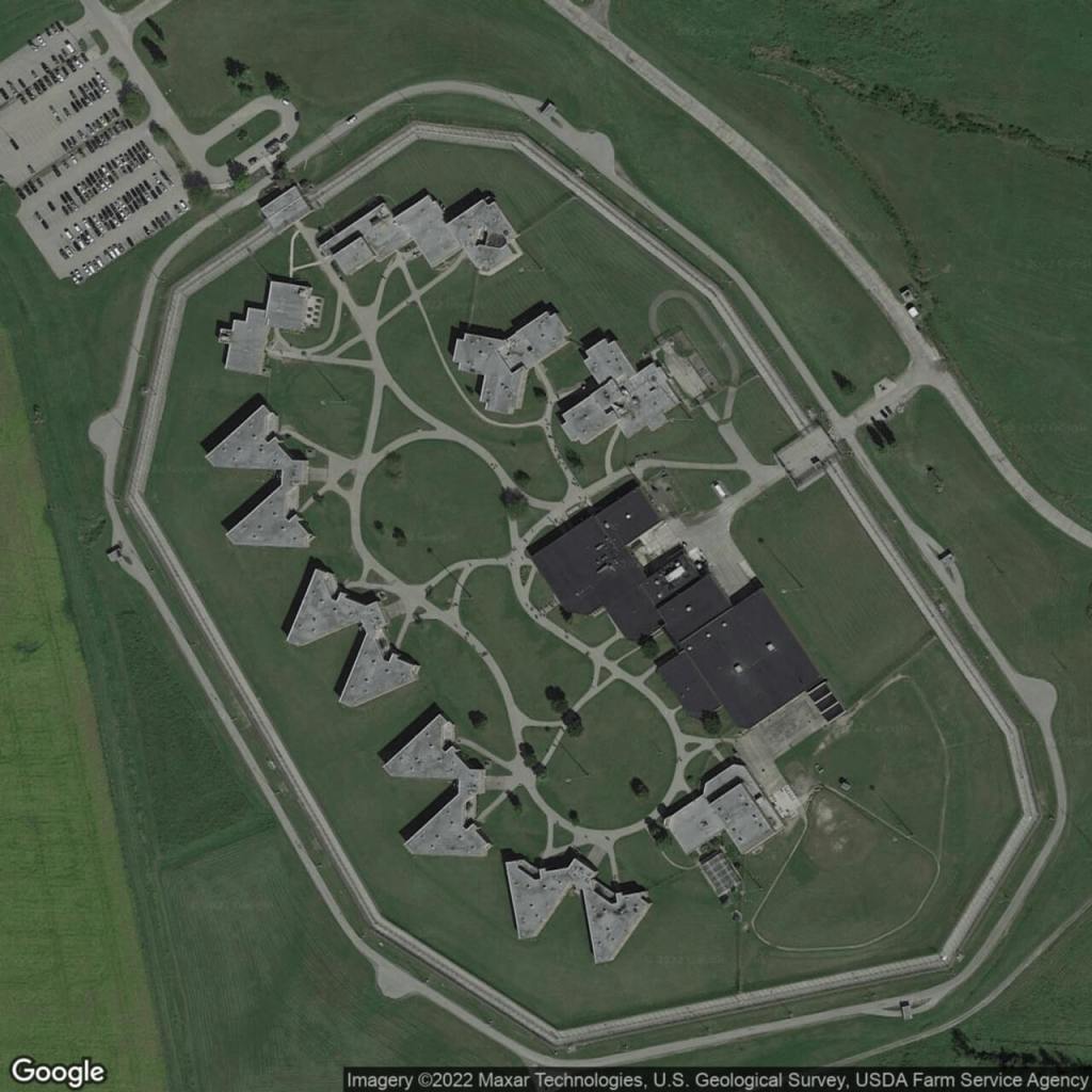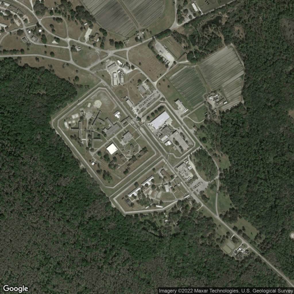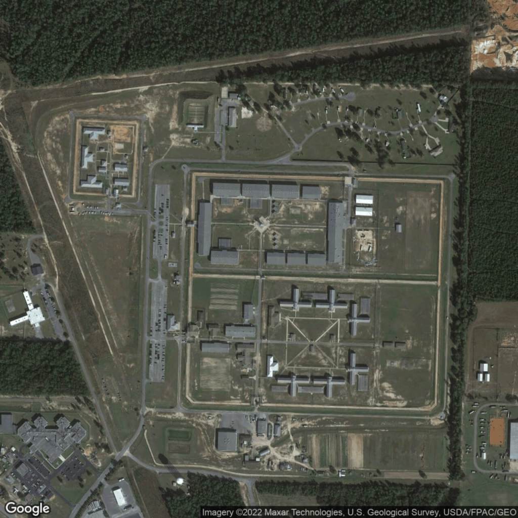 There are at least 662 prisons with prisoners who participate in some form of agriculture. This is sometimes visible from the air, revealing the carcerality of agricultural landscapes, while other times it is invisible, suggesting the carceral power to hide agricultural practices inside carceral architecture. While one could focus strictly on prisons, this would be to ignore the permeability of carceral space and the relationship of prisons to the broader social and ecological communities within which they reside. There are two images for each prison. The first is zoomed out to visually let the eyes stretch beyond prison walls, while the second is zoomed in to focus the viewer on the bricolage of agriculture and prison architecture.