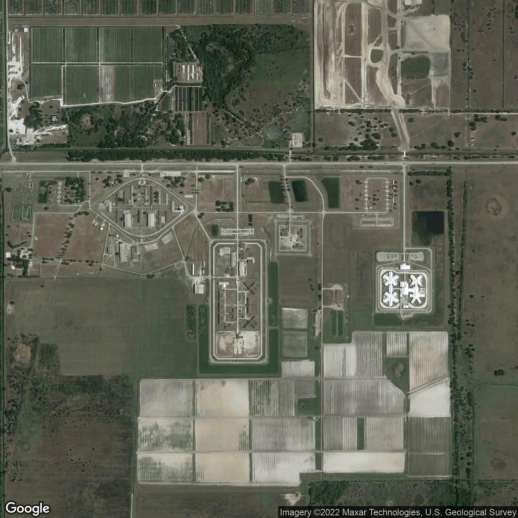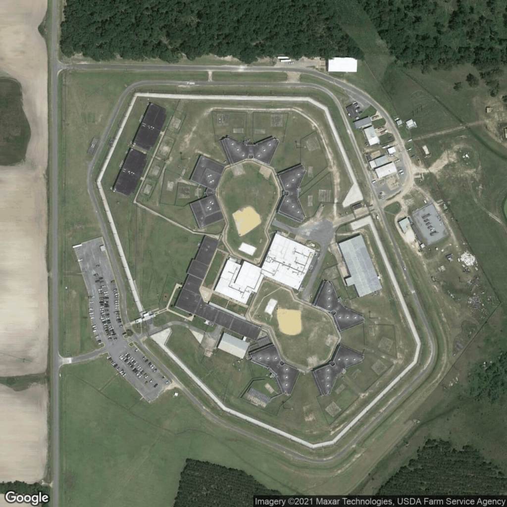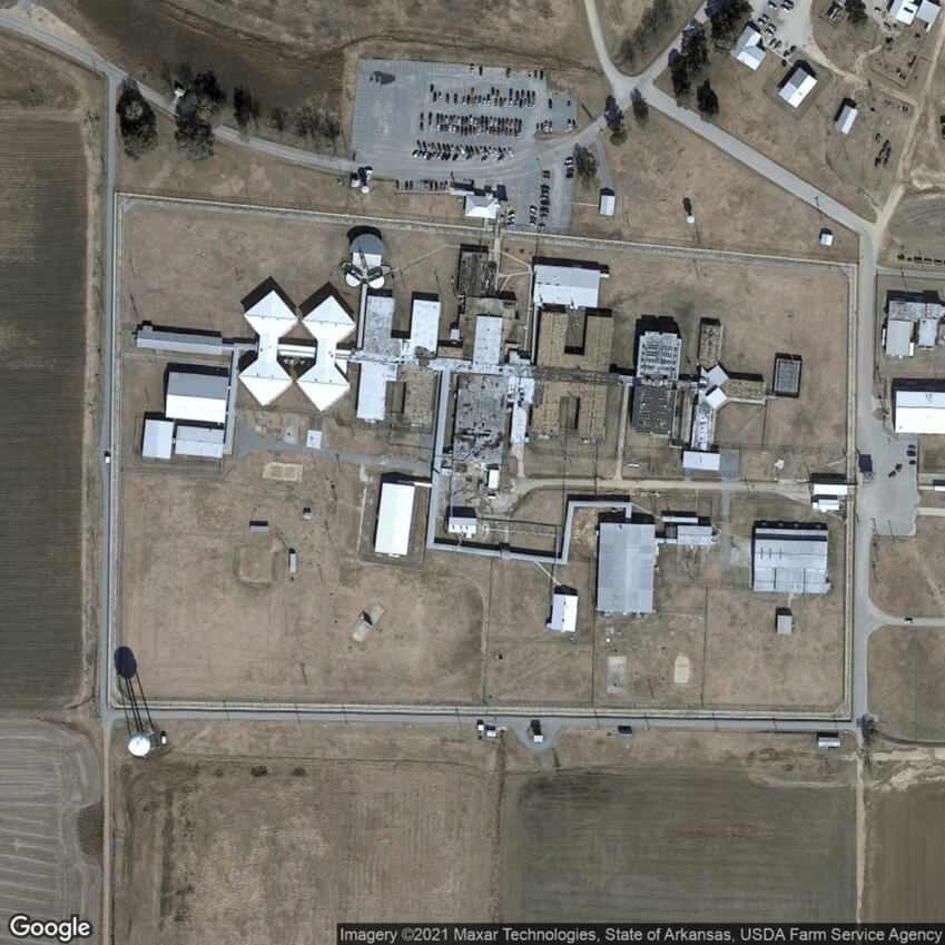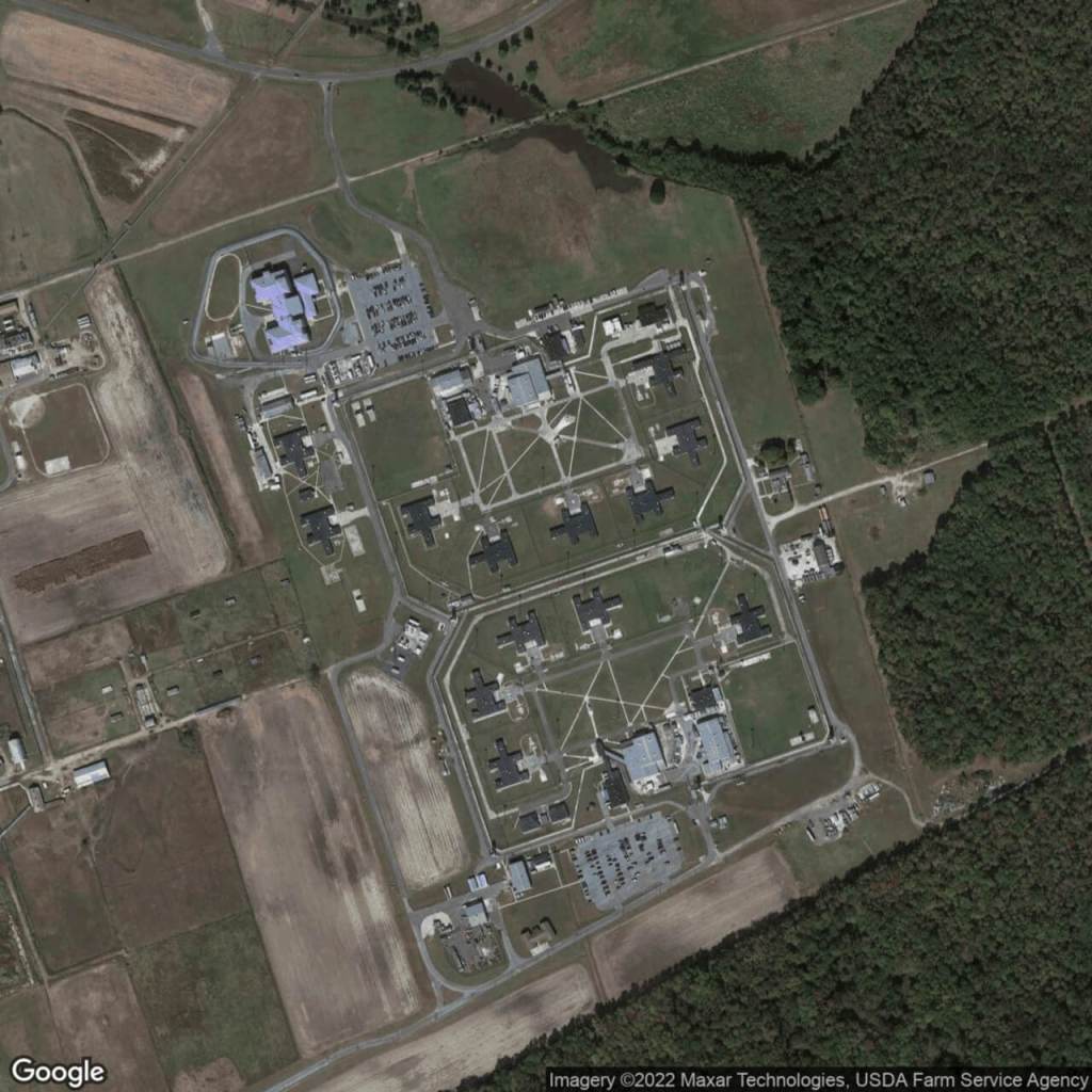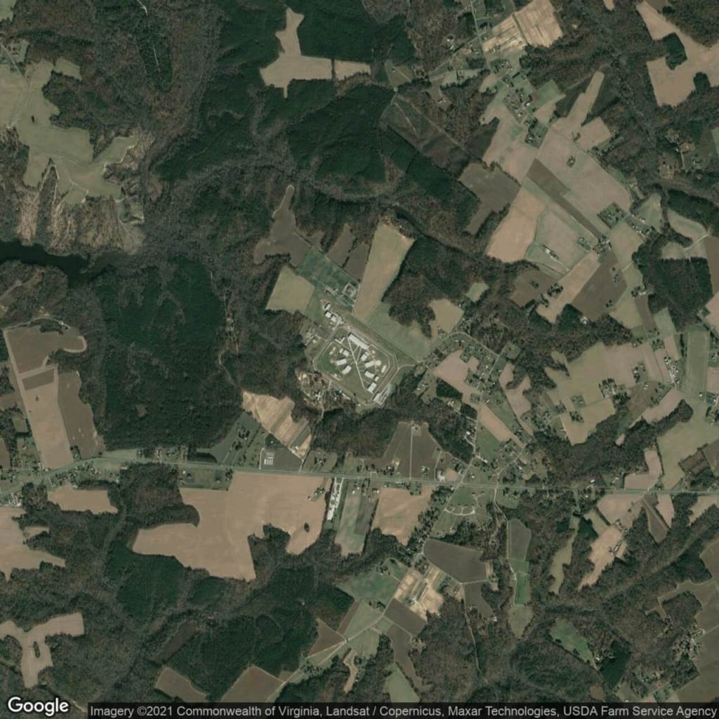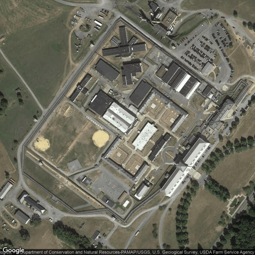 There are at least 662 prisons with prisoners who participate in some form of agriculture. This is sometimes visible from the air, revealing the carcerality of agricultural landscapes, while other times it is invisible, suggesting the carceral power to hide agricultural practices inside carceral architecture. While one could focus strictly on prisons, this would be to ignore the permeability of carceral space and the relationship of prisons to the broader social and ecological communities within which they reside. There are two images for each prison. The first is zoomed out to visually let the eyes stretch beyond prison walls, while the second is zoomed in to focus the viewer on the bricolage of agriculture and prison architecture.