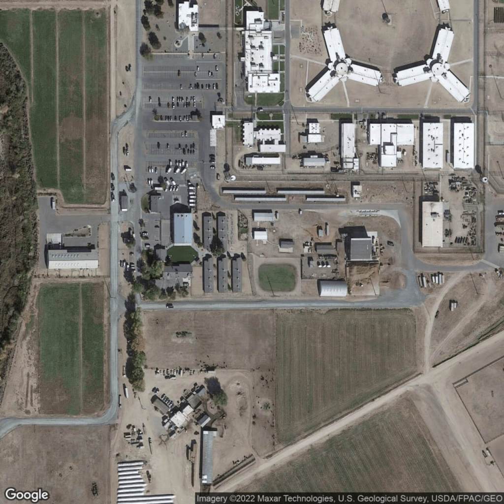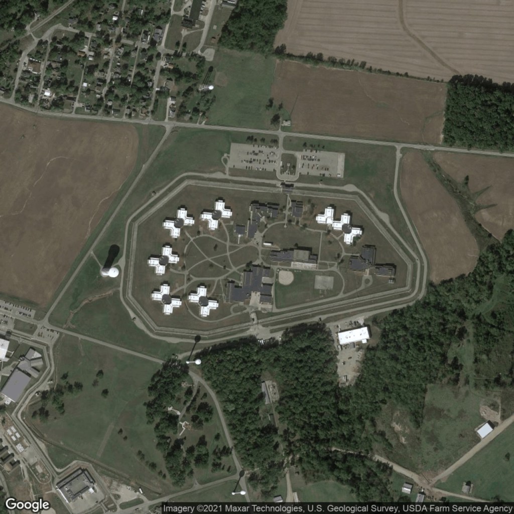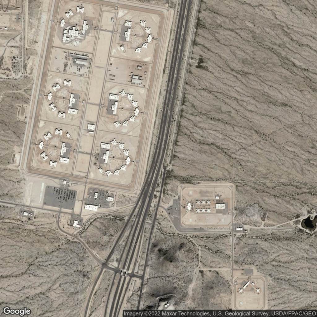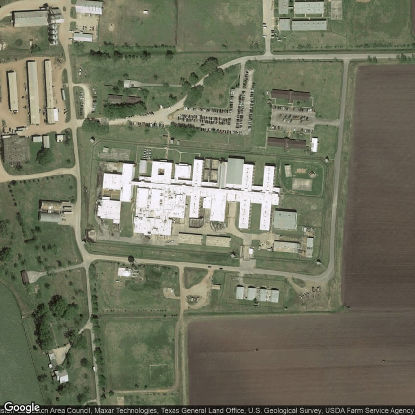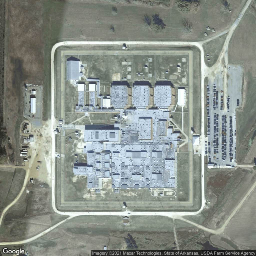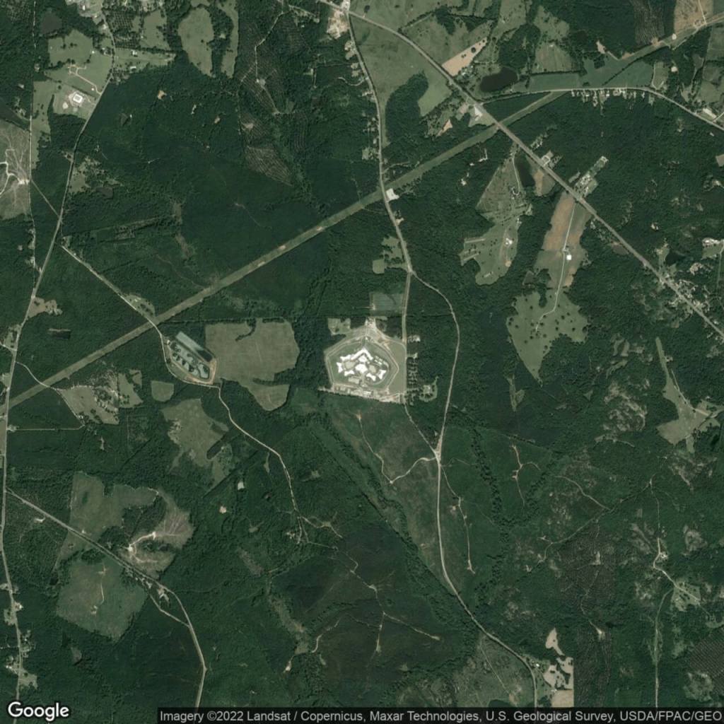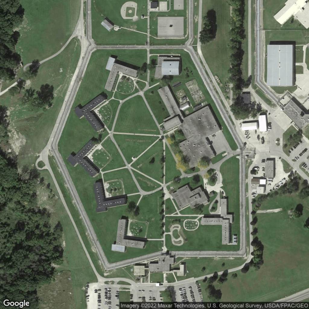 There are at least 662 prisons with prisoners who participate in some form of agriculture. This is sometimes visible from the air, revealing the carcerality of agricultural landscapes, while other times it is invisible, suggesting the carceral power to hide agricultural practices inside carceral architecture. While one could focus strictly on prisons, this would be to ignore the permeability of carceral space and the relationship of prisons to the broader social and ecological communities within which they reside. There are two images for each prison. The first is zoomed out to visually let the eyes stretch beyond prison walls, while the second is zoomed in to focus the viewer on the bricolage of agriculture and prison architecture.