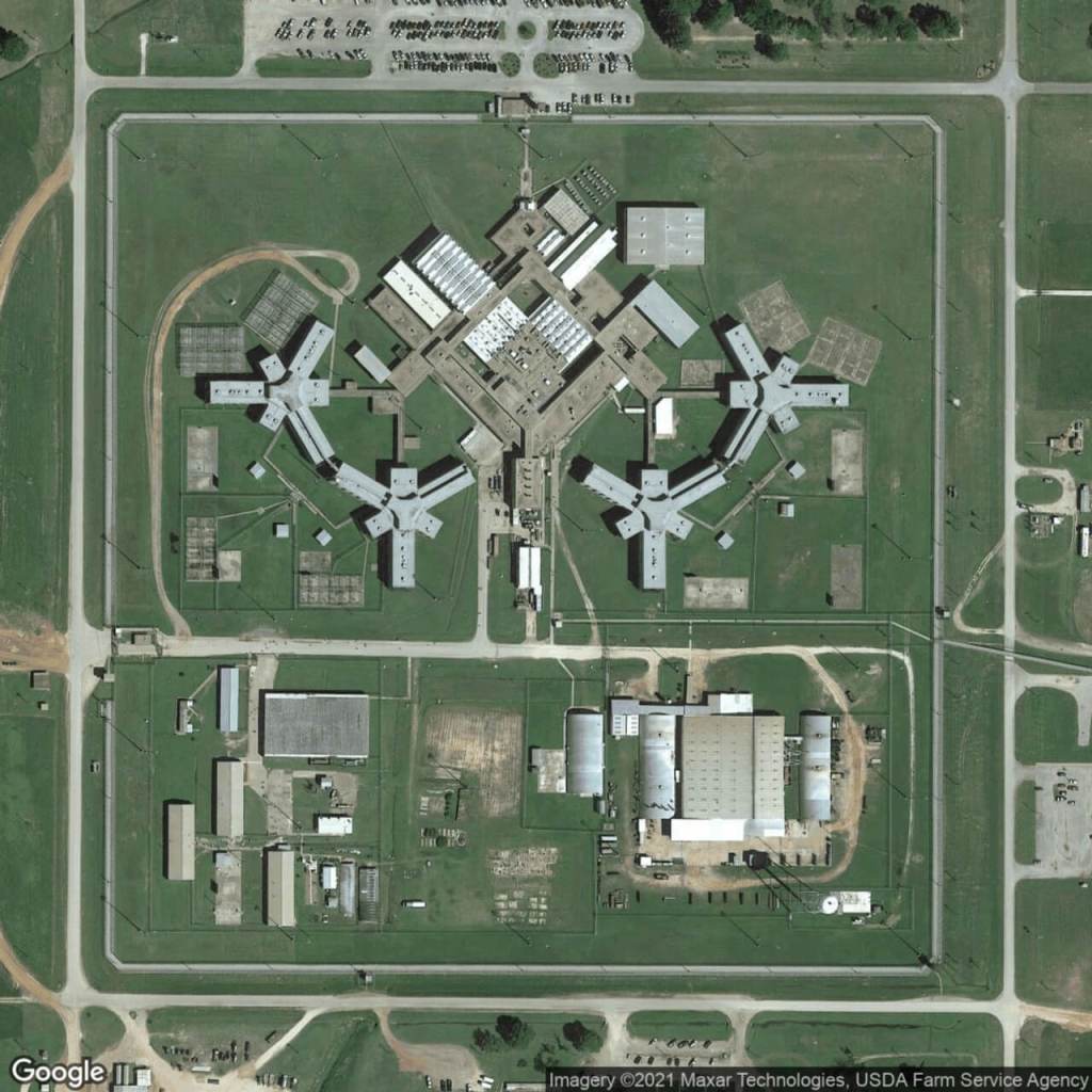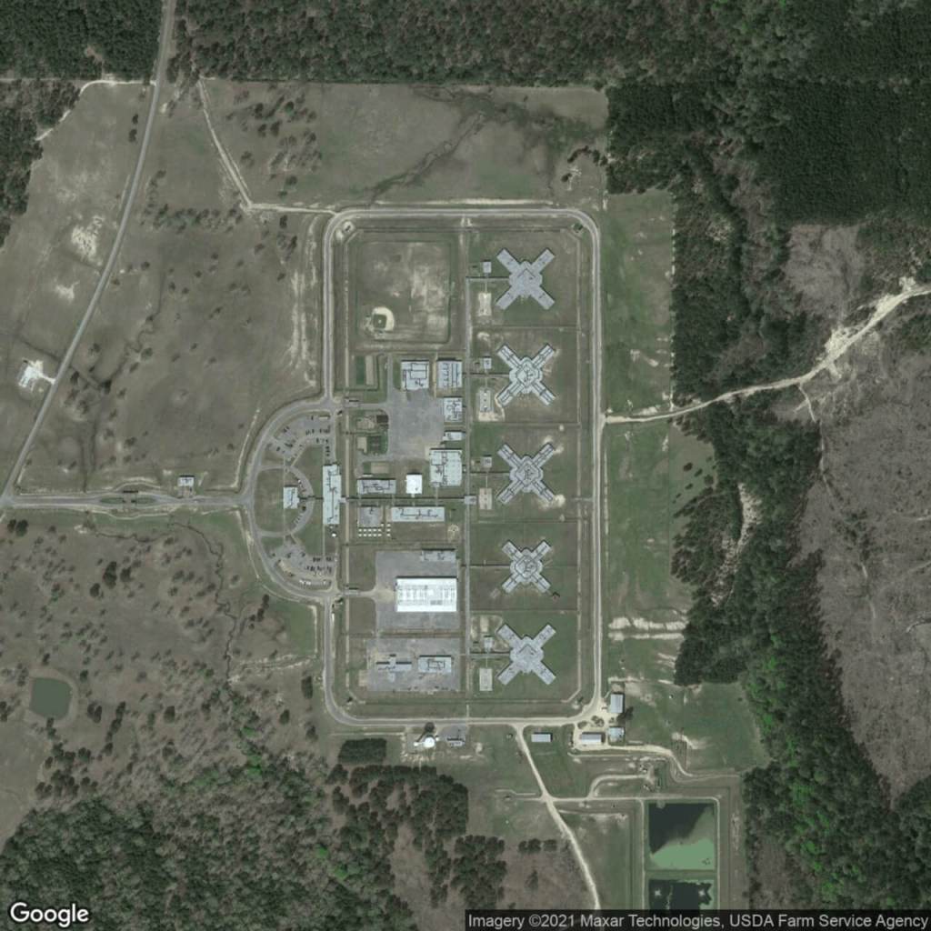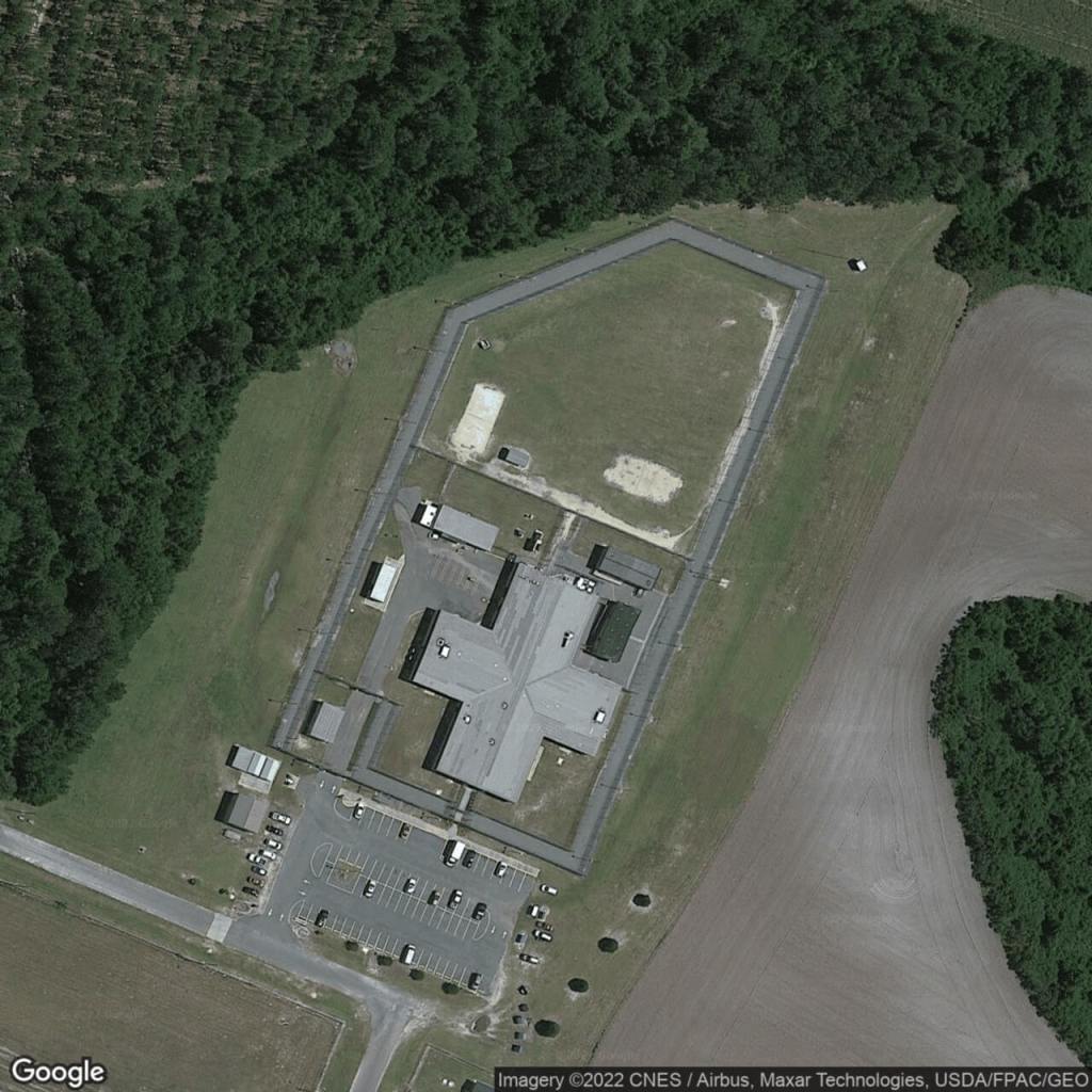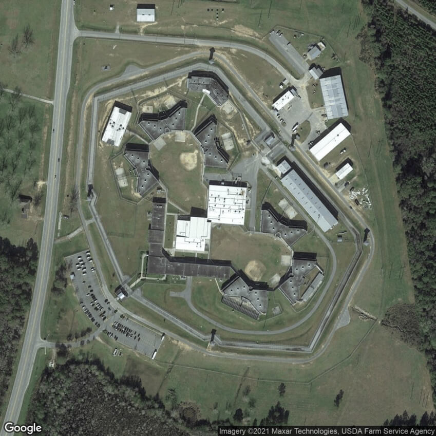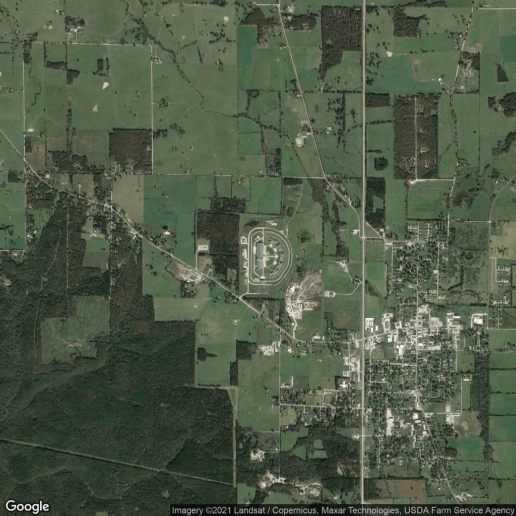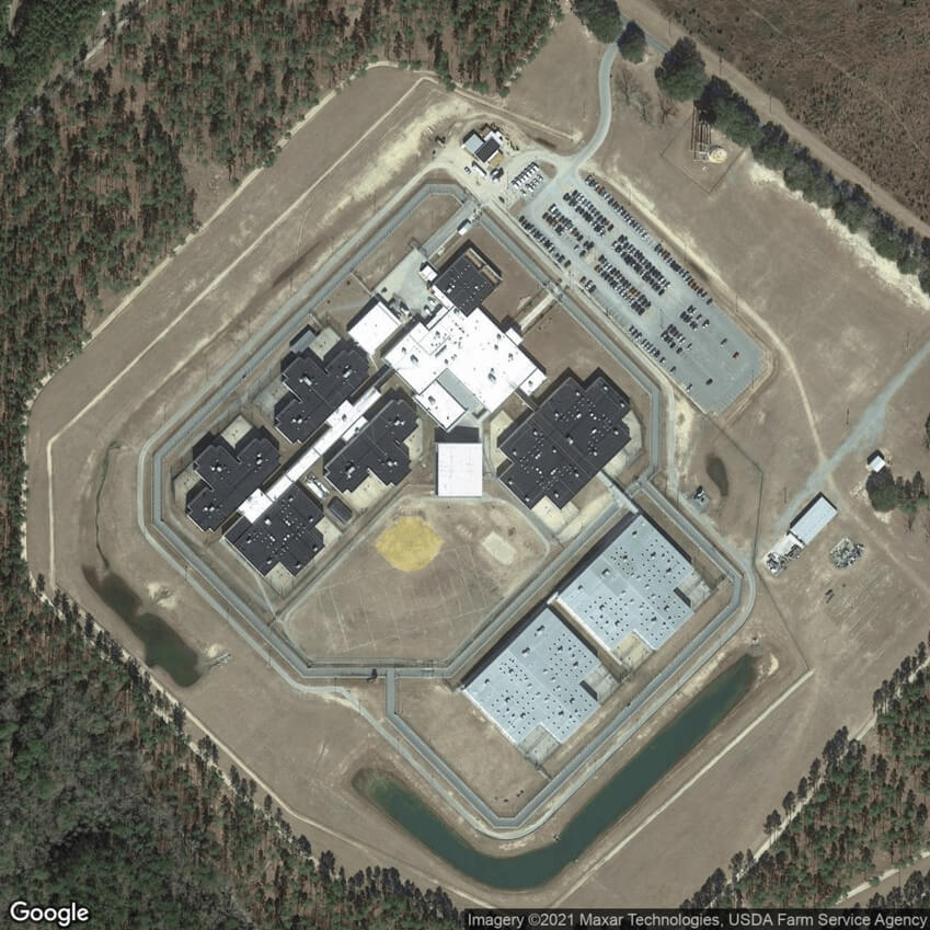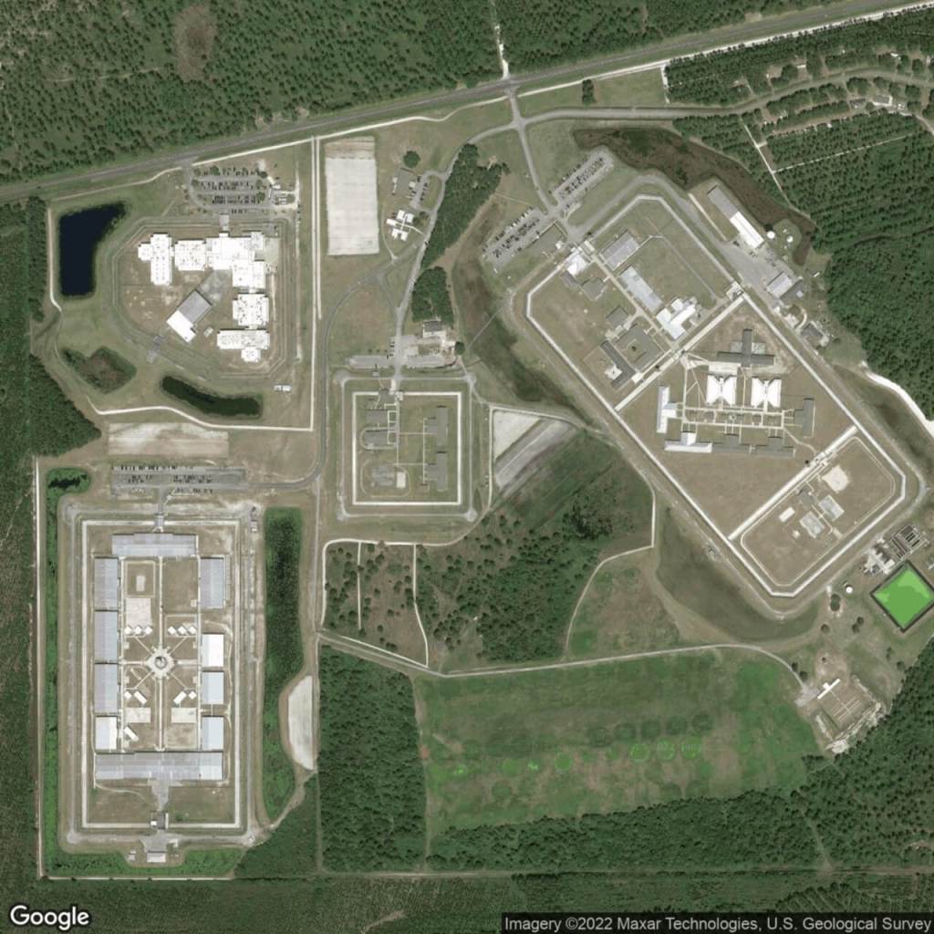 There are at least 662 prisons with prisoners who participate in some form of agriculture. This is sometimes visible from the air, revealing the carcerality of agricultural landscapes, while other times it is invisible, suggesting the carceral power to hide agricultural practices inside carceral architecture. While one could focus strictly on prisons, this would be to ignore the permeability of carceral space and the relationship of prisons to the broader social and ecological communities within which they reside. There are two images for each prison. The first is zoomed out to visually let the eyes stretch beyond prison walls, while the second is zoomed in to focus the viewer on the bricolage of agriculture and prison architecture.